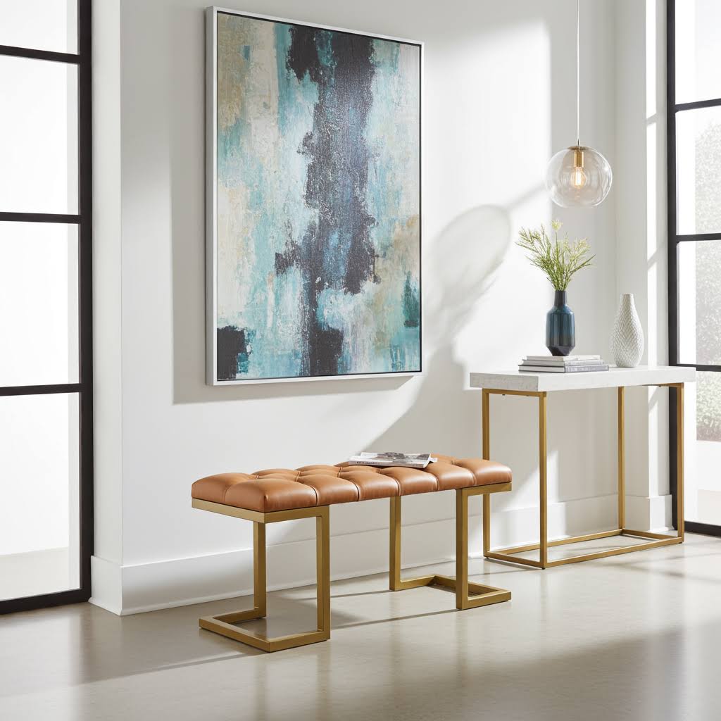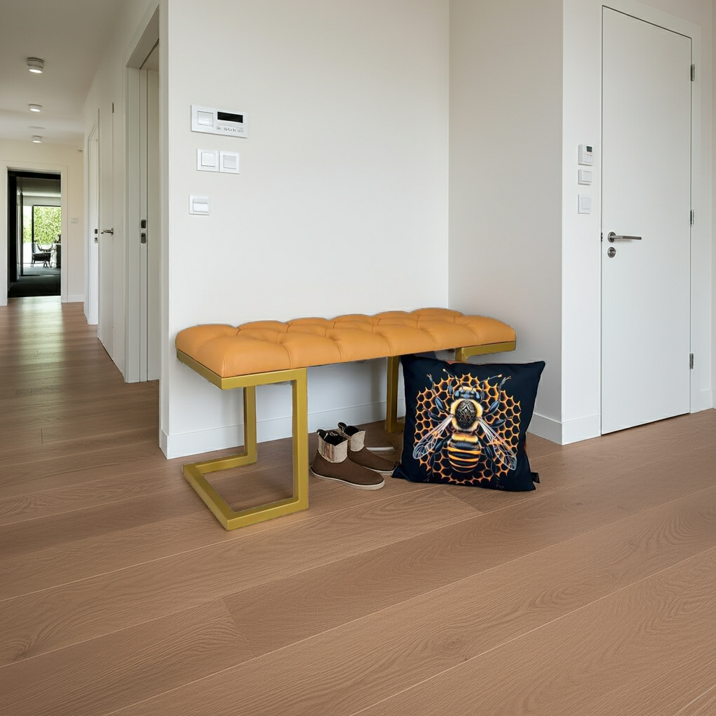 Add a bold and sophisticated accent to your home with this cognac eco leather bench from PouffeLove. The plush, tufted seat in a warm cognac shade creates a welcoming and luxurious feel. Its gold powder-coated metal frame adds a modern, glamorous touch that stands out in any Irish interior.