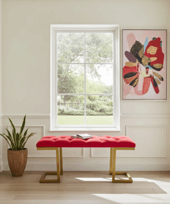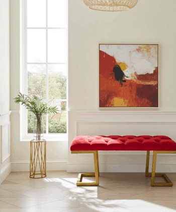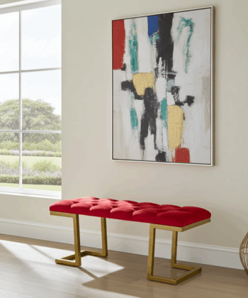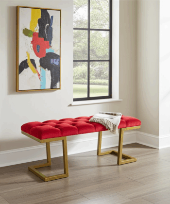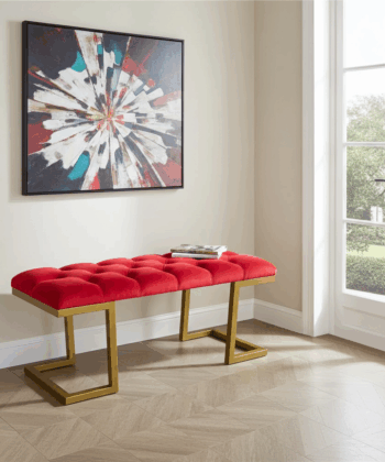 The bench showcases premium velour upholstery in rich red. Additionally, deep button tufting creates visual texture and enhanced comfort. Meanwhile, the geometric gold metal frame provides excellent stability. Similarly, it adds a luxurious accent that complements various interior styles.