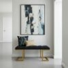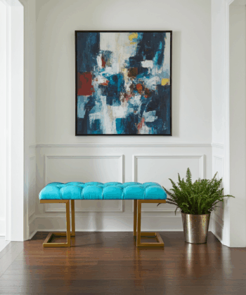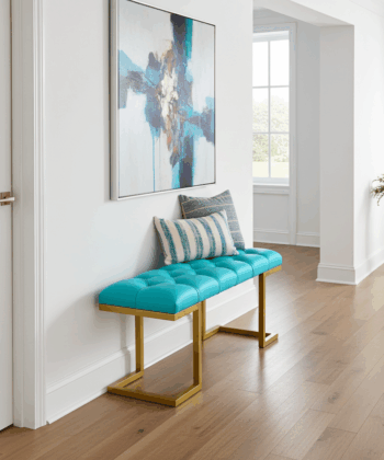 The bench showcases premium eco leather upholstery in a stunning turquoise colour with deep button tufting that creates visual texture and enhanced comfort1. Additionally, the geometric gold metal frame provides excellent stability while adding a luxurious accent that complements various interior styles from modern to eclectic.