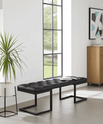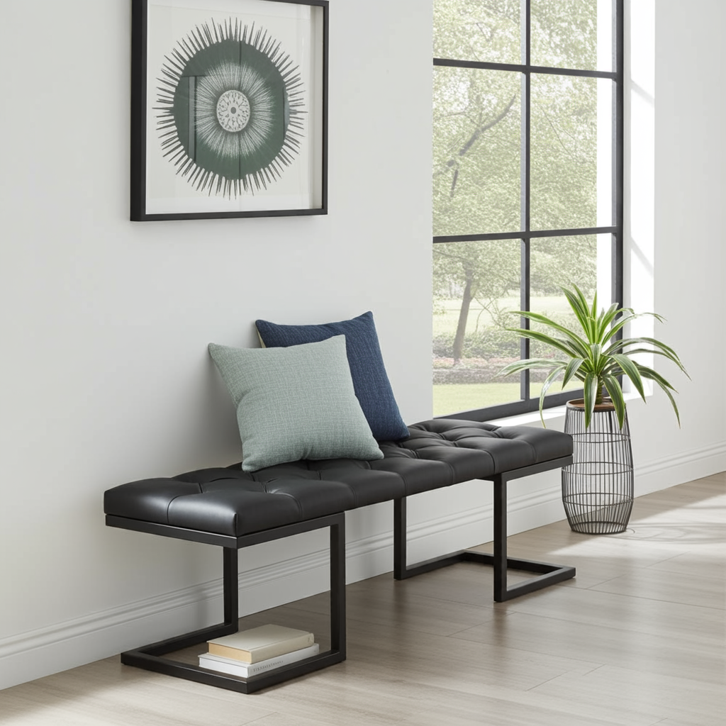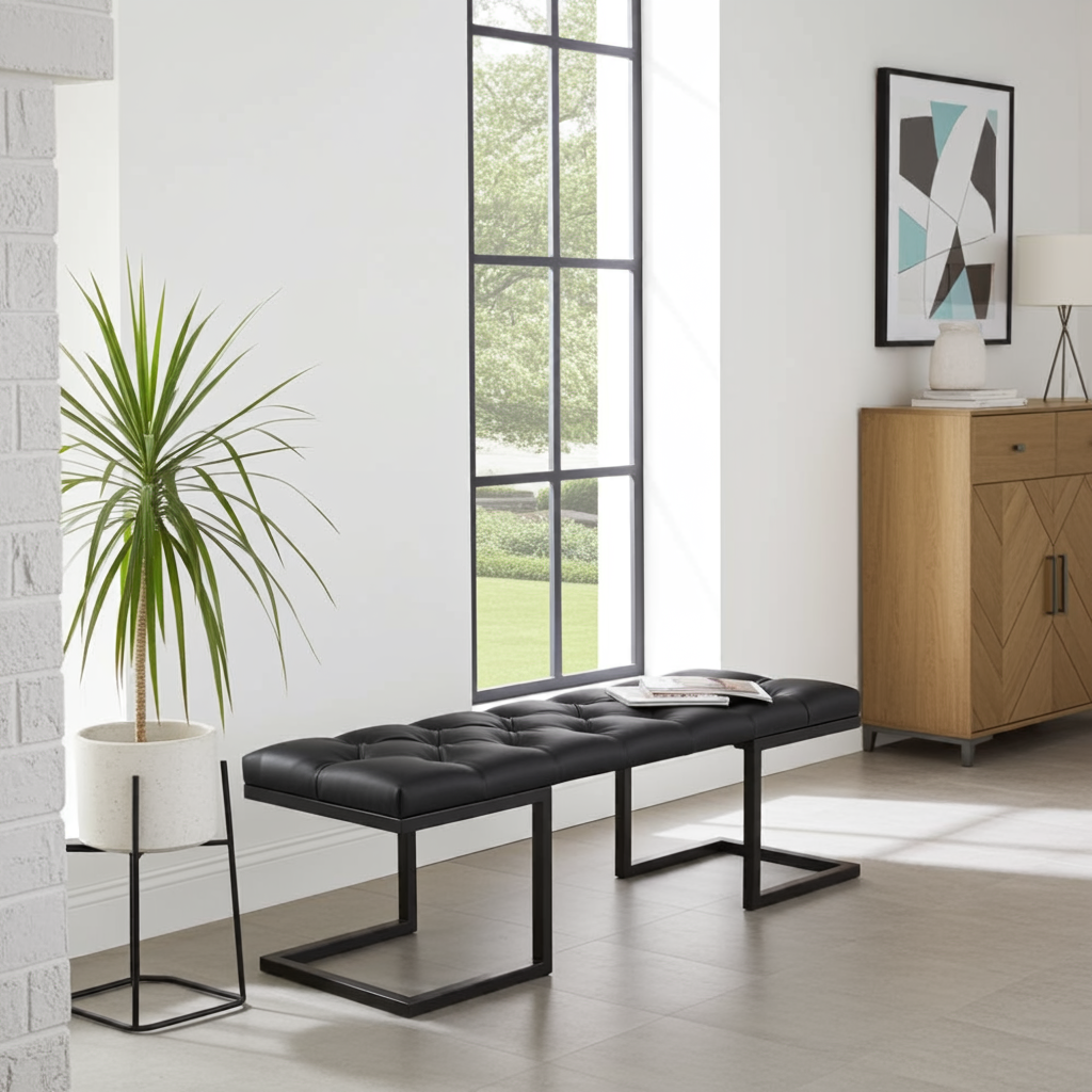 Enhance your hallway or living space with the ChicRest Upholstered Bench 140x40cm Eco Leather, also known as the Black Tufted Entryway Bench. This handmade bench features a luxurious black eco leather seat with elegant tufting and a sturdy powder-coated metal frame. Its modern geometric base and spacious seating make it perfect for entryways, bedrooms, or at the end of your bed. Not only does the bench offer comfort and durability, but it also adds a sophisticated touch to any interior