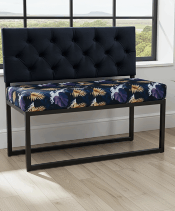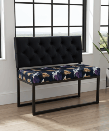 – **Dimensions**: 120cm (width) x 45cm (depth) x 90cm (height including backrest); seat height 45cm for easy access. – **Frame Material**: Powder-coated black steel for corrosion resistance and stability. – **Upholstery**: Navy patterned fabric with orange/purple motifs on seat; black velvet tufted backrest; hypoallergenic foam filling. – **Weight Capacity**: Up to 250kg, suitable for multiple users. – **Assembly**: Fully assembled upon delivery; includes protective floor glides. – **Care**: Spot clean fabrics with mild detergent; metal frame wipes easily for maintenance. – **Customization**: Available in various fabric patterns for PouffeLOVE’s made-to-order service.