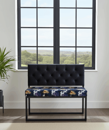 Bring bold personality and luxury comfort into your home with this handcrafted modern loft bench, expertly designed for both residential and commercial spaces in Ireland. This statement piece features a robust black powder-coated steel frame, delivering superior strength and contemporary loft styling. The generously padded seat is upholstered in vibrant, multicolour artistic fabric that energizes any interior, while the deep, button-tufted backrest in premium black fabric provides ergonomic support and timeless elegance.