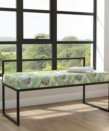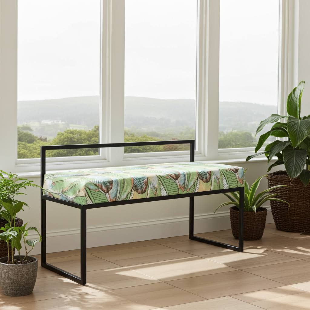 Premium Handcrafted Botanical Velour Dining Bench with Full Backrest and Industrial Black Frame – Tropical Pattern Seating Solution for Contemporary Irish Dining Spaces