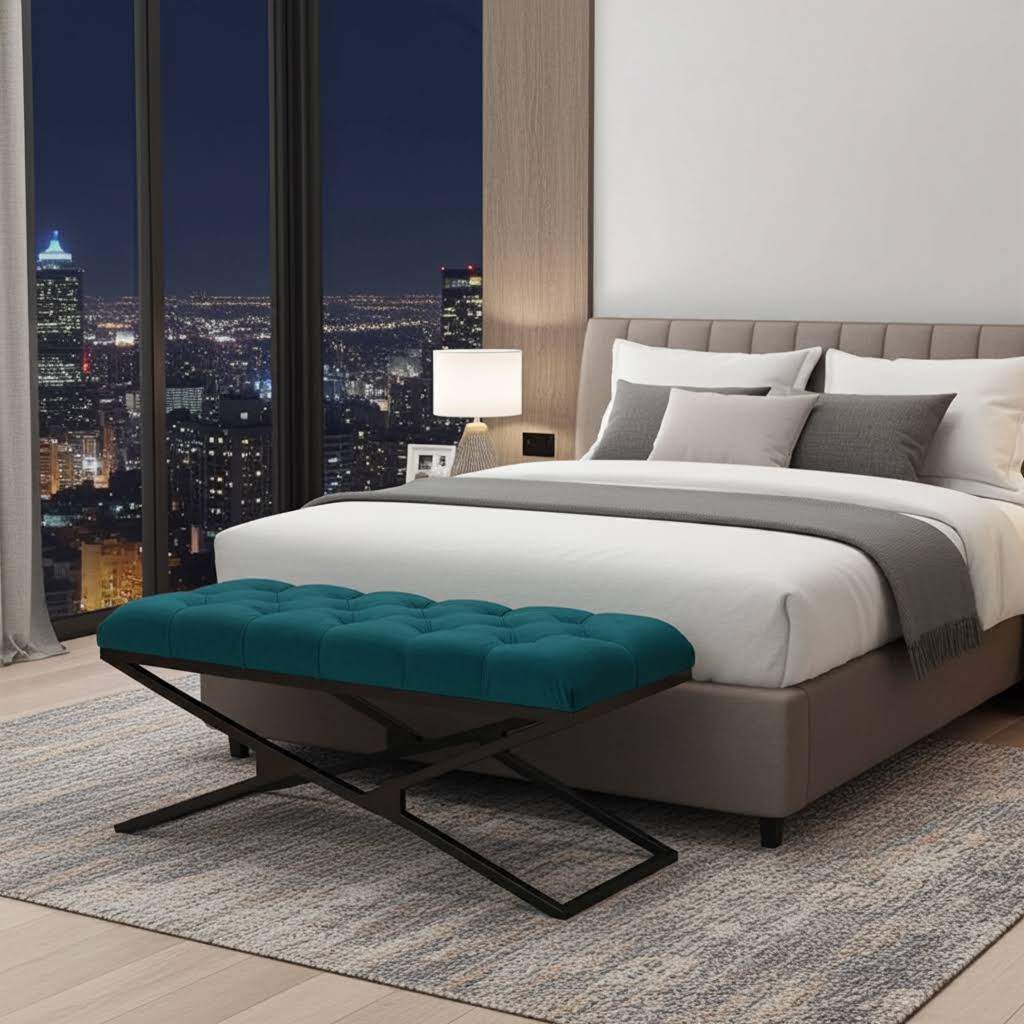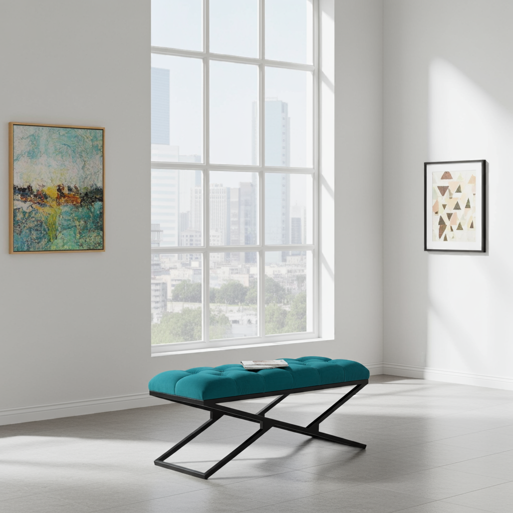 Add a bold, modern accent to your space with this Double-X-Style metal bench from PouffeLove. The plush, tufted seat is upholstered in luxurious dark green velvet, offering both comfort and a rich, exclusive look. Its geometric black powder-coated steel frame features distinctive X-shaped legs, providing excellent stability and a striking visual effect. Measuring 100cm in width, 40cm in depth, and 50cm in height, this bench fits beautifully in hallways, bedrooms, or living rooms.