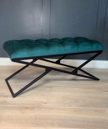 Add a bold, modern accent to your space with this Double-X-Style metal bench from PouffeLove. The plush, tufted seat is upholstered in luxurious dark green velvet, offering both comfort and a rich, exclusive look. Its geometric black powder-coated steel frame features distinctive X-shaped legs, providing excellent stability and a striking visual effect. Measuring 100cm in width, 40cm in depth, and 50cm in height, this bench fits beautifully in hallways, bedrooms, or living rooms.