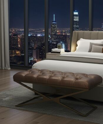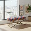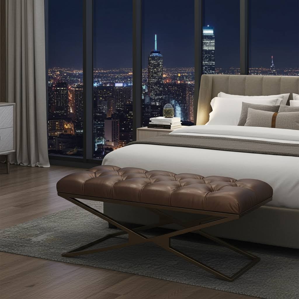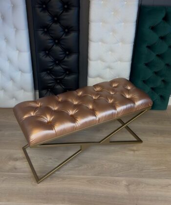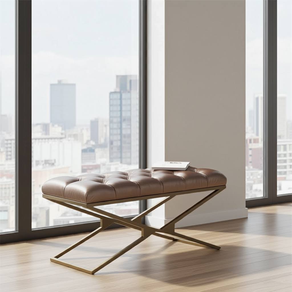 Designer Eco Leather Metal Bench with Gold Double-X Frame – Sophisticated Comfort for Contemporary Interiors