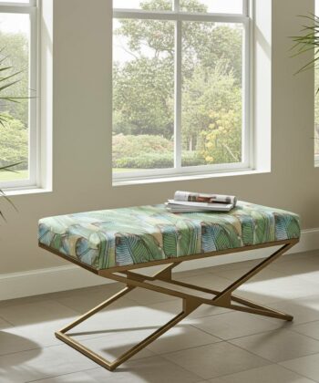Bring contemporary style and sophistication to your interior with our gold metal frame bench with green botanical velour upholstery. This eye-catching bench features a sturdy gold metal frame in a chic double X style, providing both stability and a modern aesthetic. The seat is upholstered in high-quality green botanical velour, offering a soft, inviting texture and a pop of vibrant color.