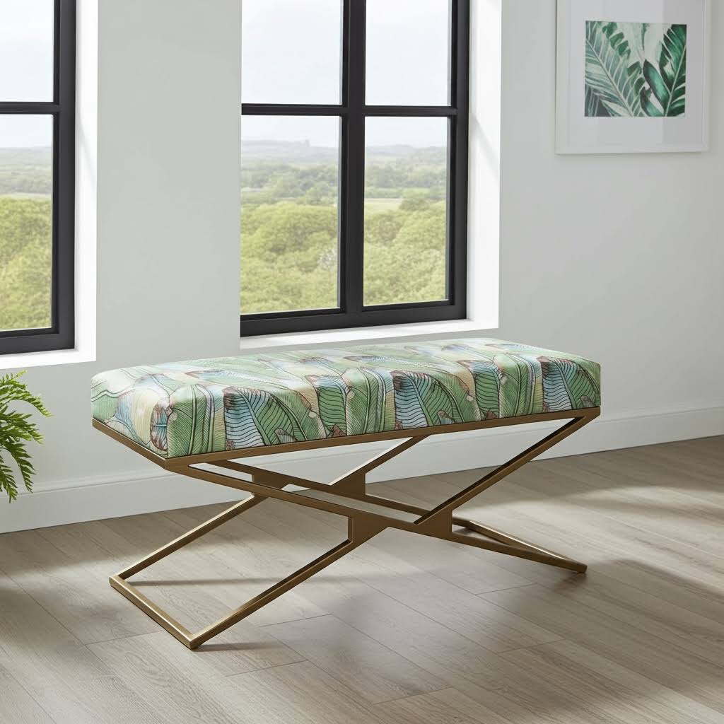 Upgrade your home décor with this gold metal frame bench with green botanical velour upholstery—a perfect blend of luxury, comfort, and contemporary design.