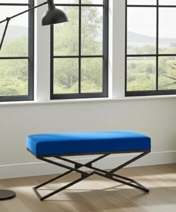 Enhance your home with the Metal-Framed Bench 100x40cm Double X Style, featuring a striking blue velvet seat and a sleek black powder-coated metal frame. This handmade bench combines luxurious comfort with modern design, making it a standout addition to hallways, living rooms, bedrooms, or any space that needs a stylish accent. The double X frame not only adds visual interest but also ensures long-lasting stability.