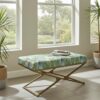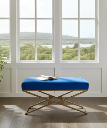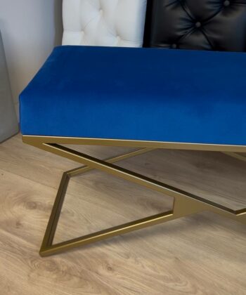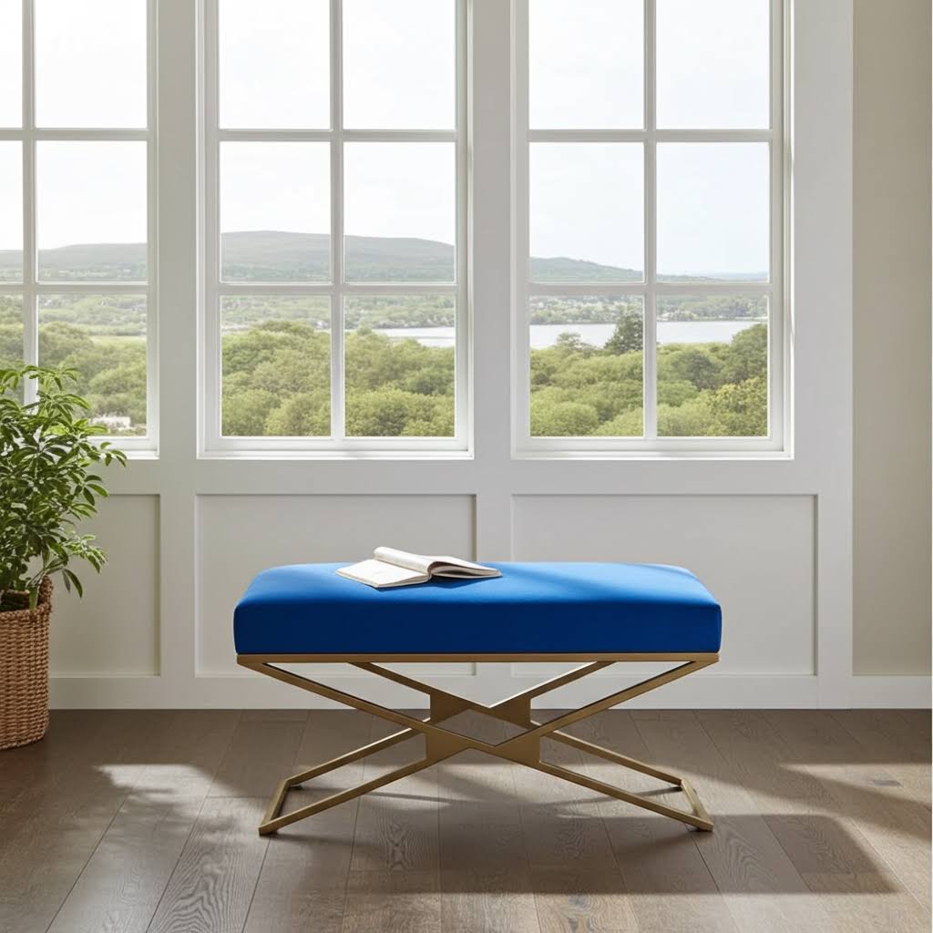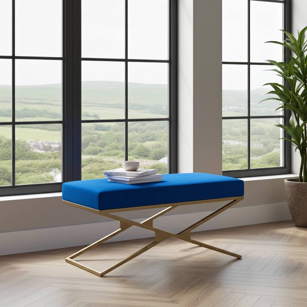 Velvet Upholstered Metal Bench with Gold Double-X Frame – Elegant Blue Accent for Contemporary Irish Interiors