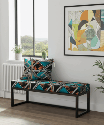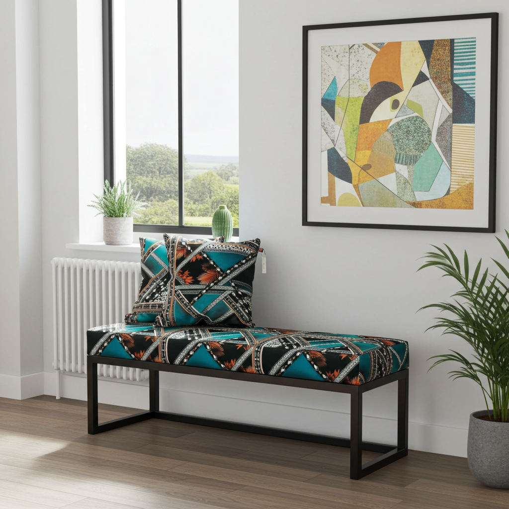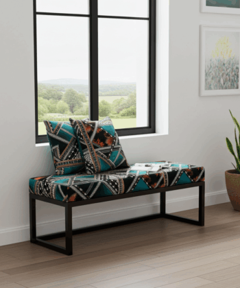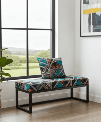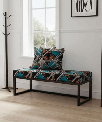 This exceptional geometric patterned bench combines bold southwestern design elements with sophisticated craftsmanship through its striking upholstery and modern frame construction. Moreover, it features premium velvet with an intricate turquoise and black geometric pattern paired with a robust black powder-coated steel frame. Additionally, the generous 120x40cm dimensions provide ample seating space while making a dramatic style statement. Furthermore, the tribal-inspired geometric motifs bring cultural richness and artistic flair to contemporary Irish living environments.
