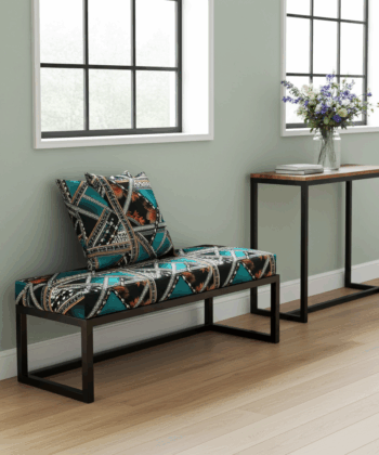 The bench showcases premium velvet upholstery featuring an elaborate southwestern geometric pattern with turquoise, black, and accent colors that create sophisticated visual interest. Additionally, the bold pattern serves as a stunning focal point that complements various interior design schemes. Meanwhile, the black powder-coated steel frame ensures exceptional structural integrity and contemporary appeal. Similarly, the handcrafted construction delivers superior quality suitable for daily residential use and entertaining.