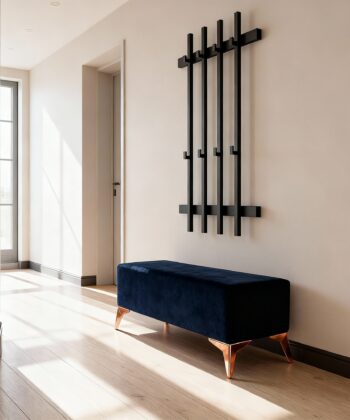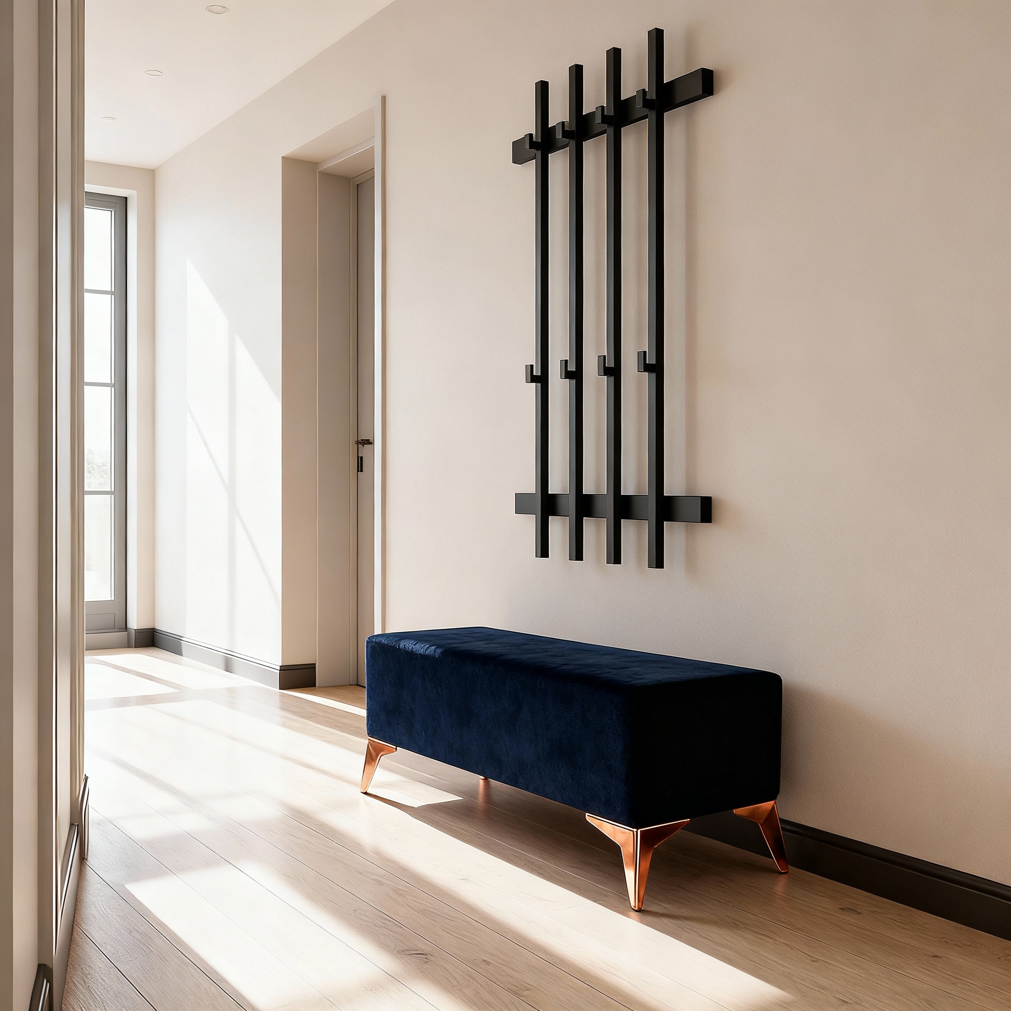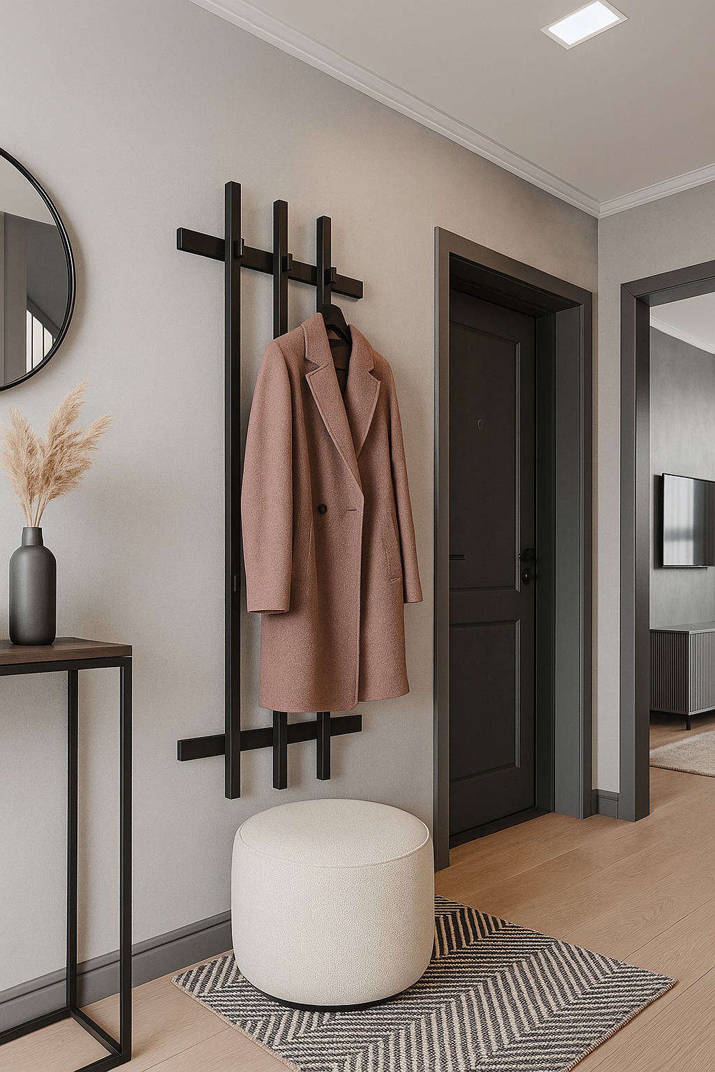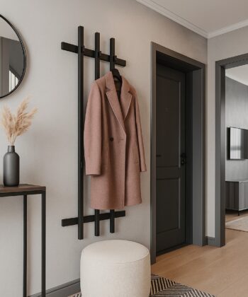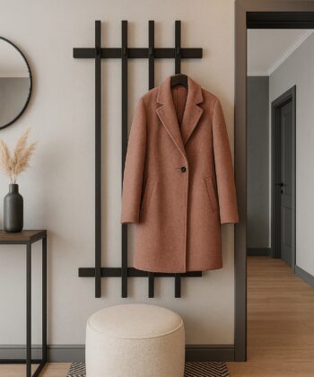 This metal wall organiser keeps coats, jackets, bags, and umbrellas in order while also serving as a design feature that elevates the hallway. As a result, entrances remain neat and welcoming; meanwhile, the powder‑coated surface wipes clean easily and stays looking smart with daily use.