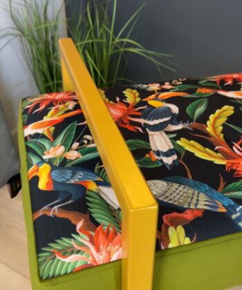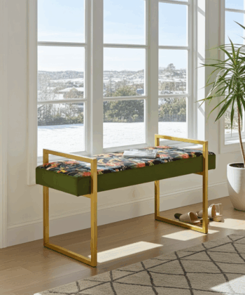 The Tropical Velvet Bench features a sturdy gold metal frame and a plush velvet seat with a colorful floral design. This modern bench adds vibrant style and comfort to living rooms, bedrooms, or entryways, making it a perfect accent for any space