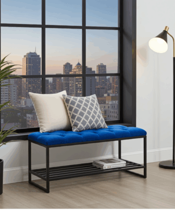 Luxury Tufted Velvet Bench with Blue Top and Metal Frame Shoe Rack – Modern Storage Solution