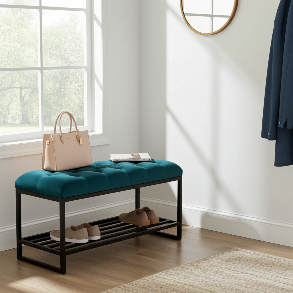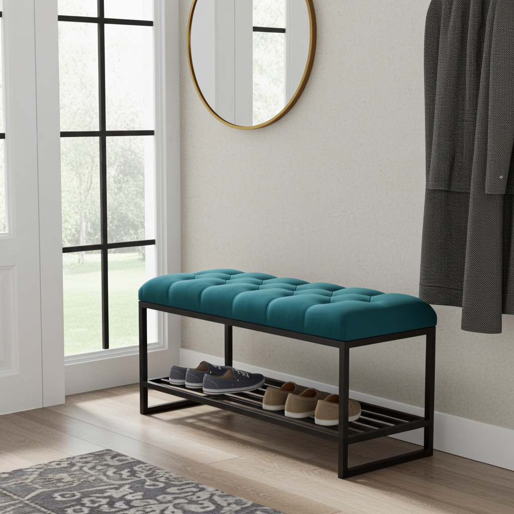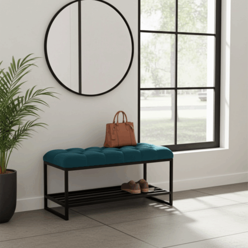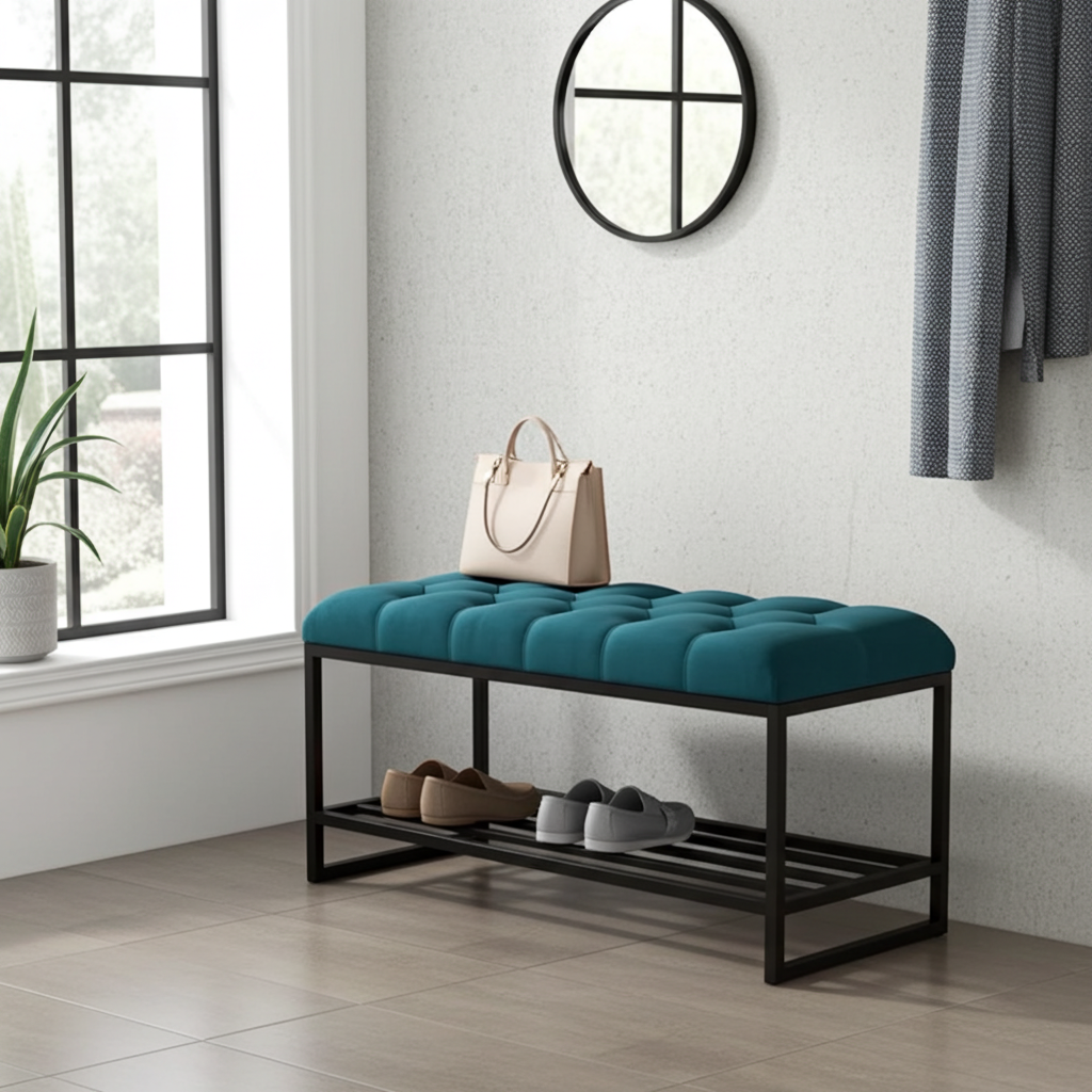 The Luxury Tufted Velvet Bench Blue Top Metal Frame Shoe Rack brings modern elegance and practical storage to your home. Its vibrant blue velvet seat adds a bold accent, while the tufted upholstery ensures plush comfort. Because we use high-quality materials, you can enjoy both durability and style for years.