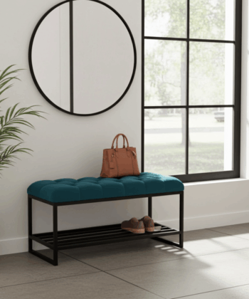 We craft the frame from welded steel profiles and finish it with a matte black powder coating. This process guarantees long-lasting strength and a refined look. As a result, the bench remains stable and visually appealing. The integrated shoe rack below the seat allows you to organize footwear efficiently, so your hallway or bedroom stays tidy. Moreover, the open shelf design makes cleaning quick and simple.