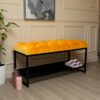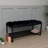 Beneath the elegant seat, a sturdy metal shoe rack offers a convenient and tidy storage solution for your favourite footwear. This integrated feature helps keep your space organised and clutter-free. The entire structure is supported by a robust, powder-coated metal frame in a chic matte black finish, ensuring stability and long-lasting durability.