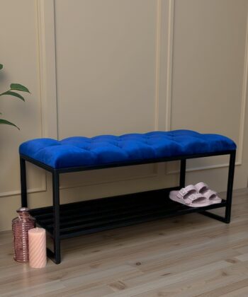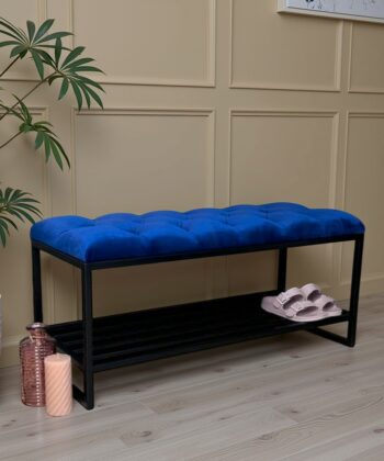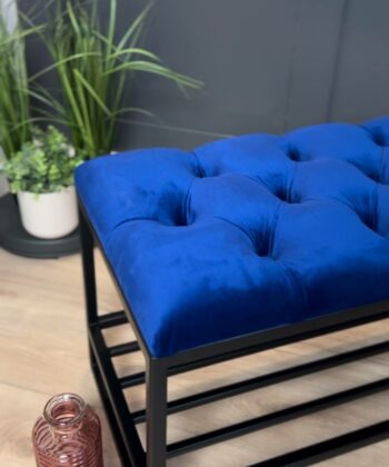 Luxury Tufted Velvet Bench with Blue Top and Metal Frame Shoe Rack – Modern Storage Solution