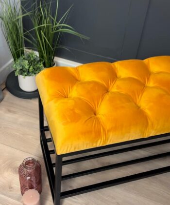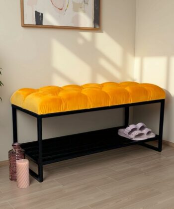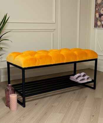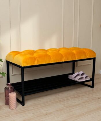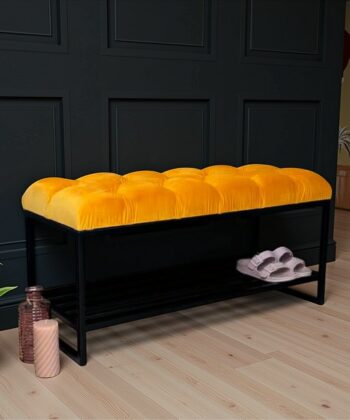 The Luxury Tufted Velvet Bench Orange Top Metal Frame Shoe Rack features vibrant orange velvet upholstery and a stylish tufted finish. This bench provides a comfortable seat and instantly adds color and sophistication to your space. The high-quality materials ensure durability and everyday comfort1.