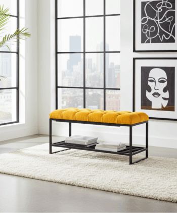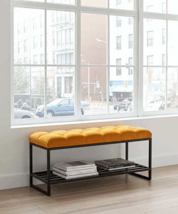 The Luxury Tufted Velvet Bench Orange Top Metal Frame Shoe Rack features vibrant orange velvet upholstery and a stylish tufted finish. This bench provides a comfortable seat and instantly adds color and sophistication to your space. The high-quality materials ensure durability and everyday comfort1.