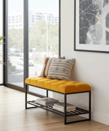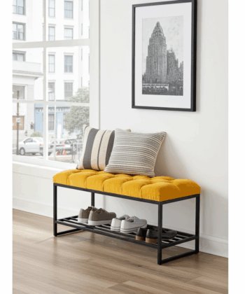 This bench includes a sturdy metal shoe rack beneath the seat. As a result, you can organize multiple pairs of shoes and keep your hallway or bedroom tidy. The open design allows for easy access and quick cleaning, so you always maintain a clutter-free area1.