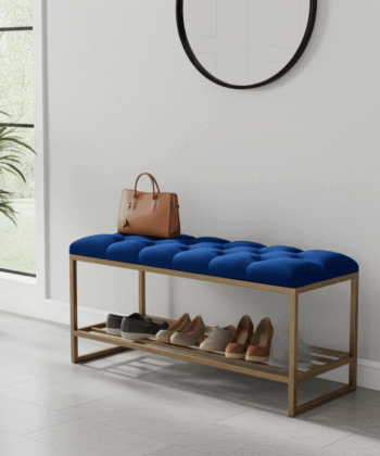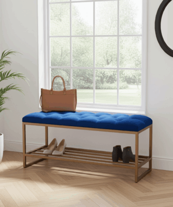 Transform your hallway or bedroom with this 100x40x45 cm royal blue velvet bench, perfectly blending luxury and function. The plush, button-tufted velvet seat offers both elegance and comfort, set atop a sleek gold metal frame. A practical integrated shoe rack below keeps your floors neat while elevating your entryway or dressing space with bold colour and sophisticated style.