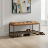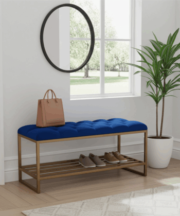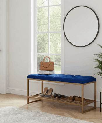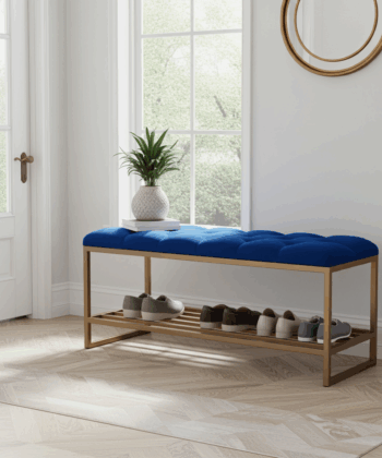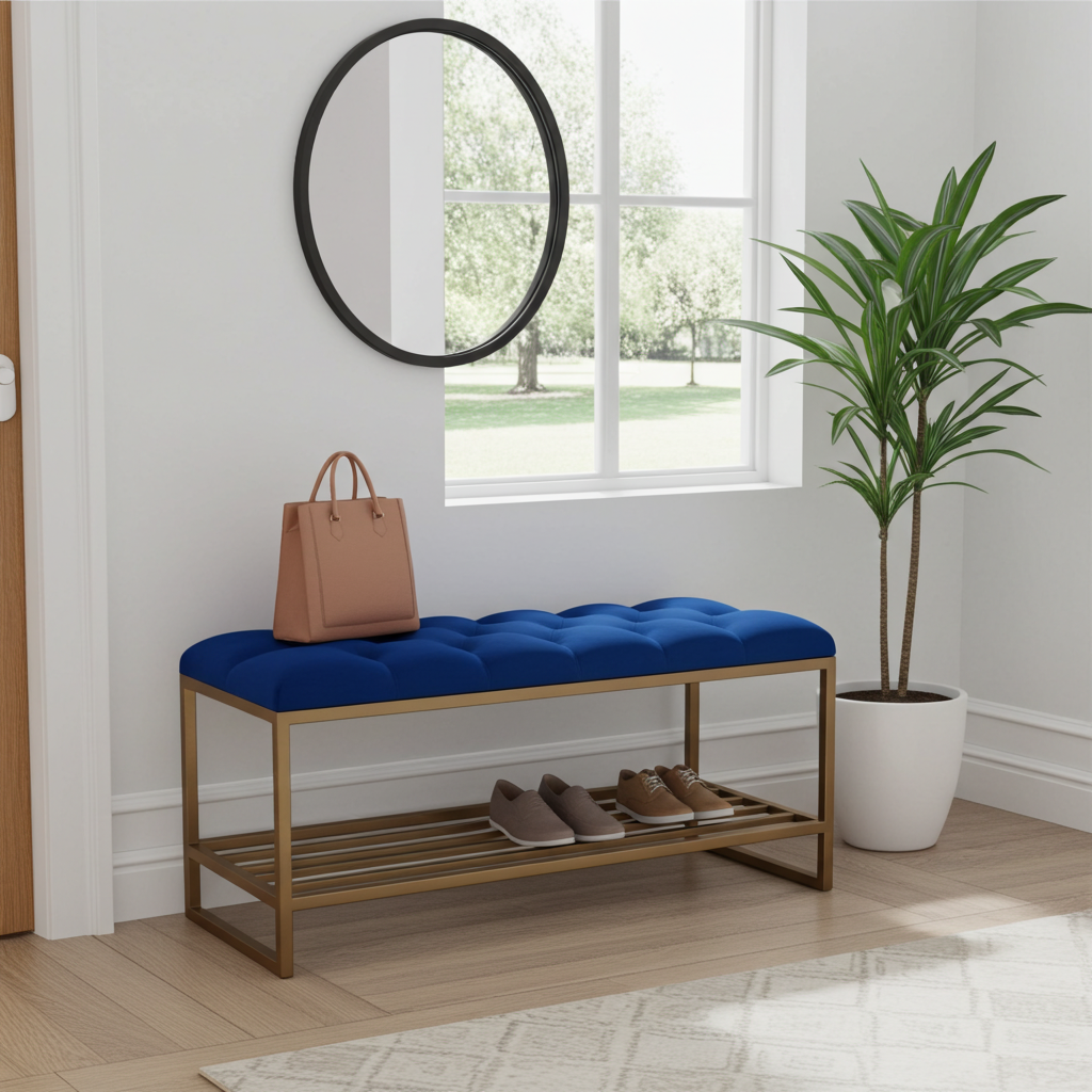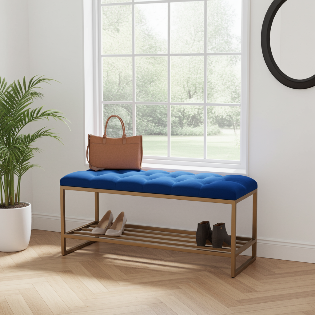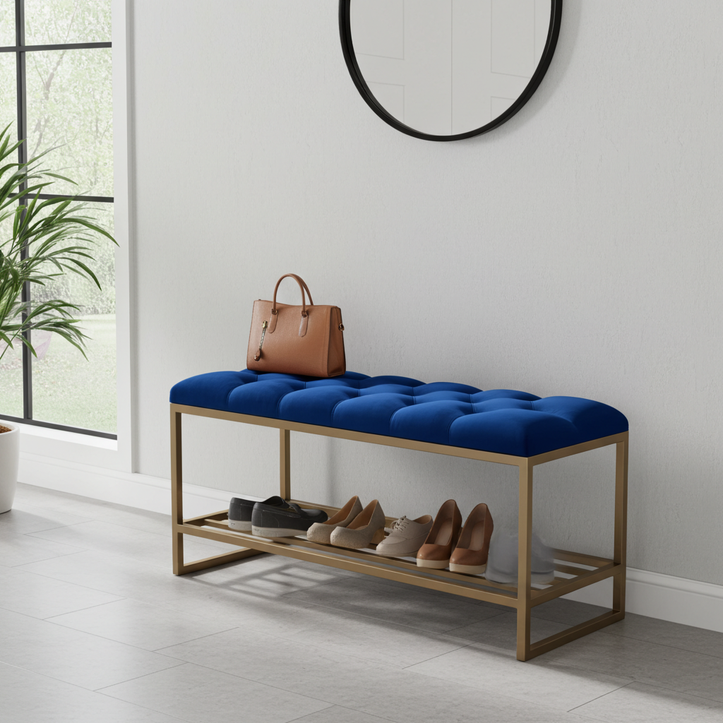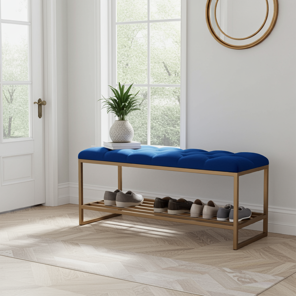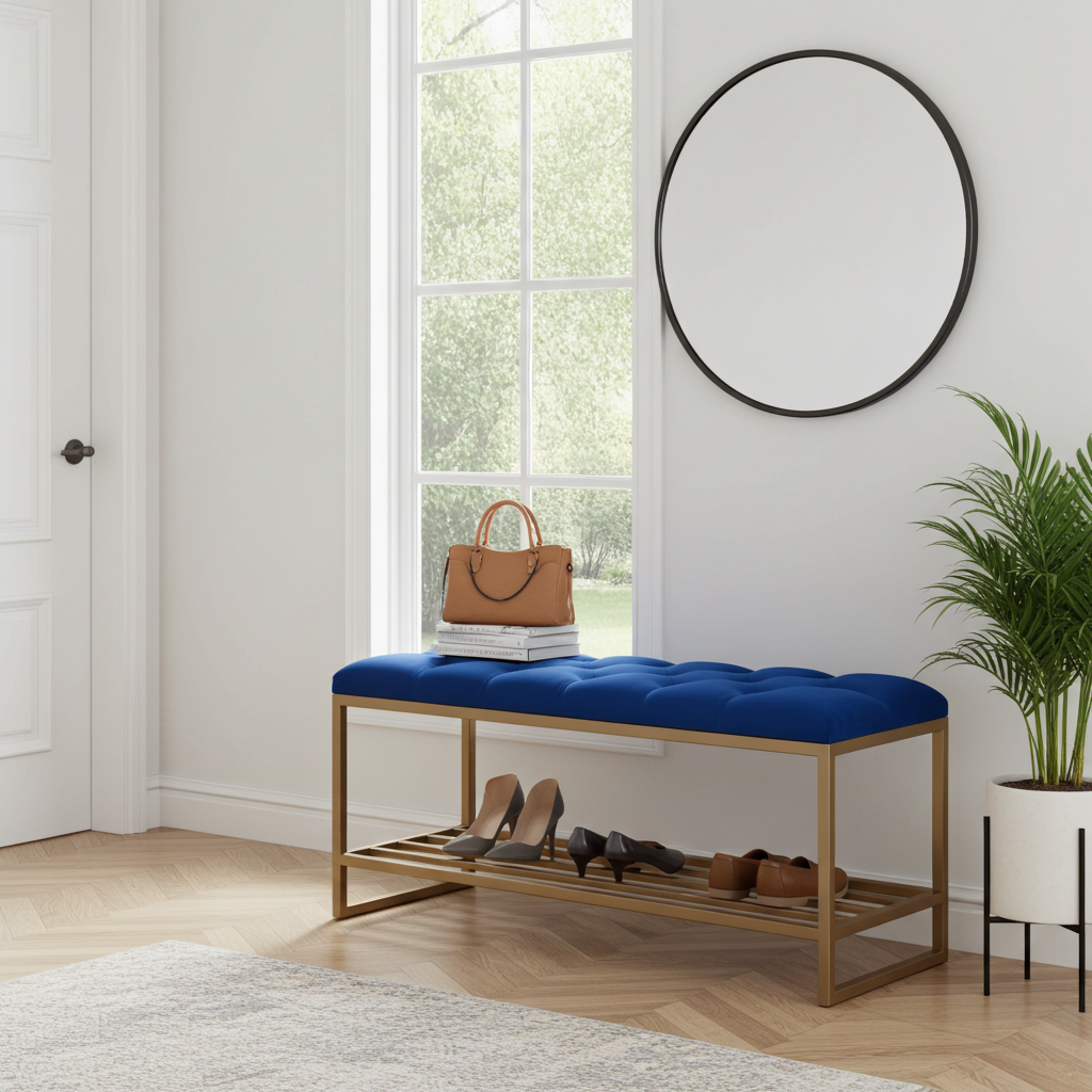Modern Tufted Blue Velvet Entryway Bench – Gold Frame and Shoe Storage for Luxe Irish Interiors