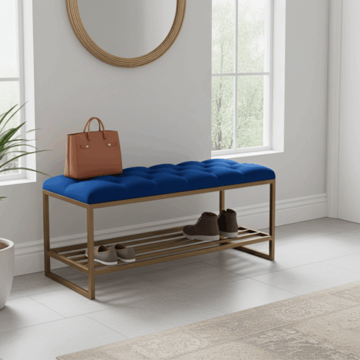 Modern Tufted Blue Velvet Entryway Bench – Gold Frame and Shoe Storage for Luxe Irish Interiors