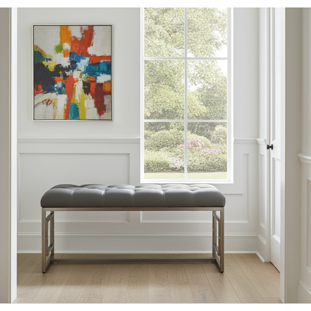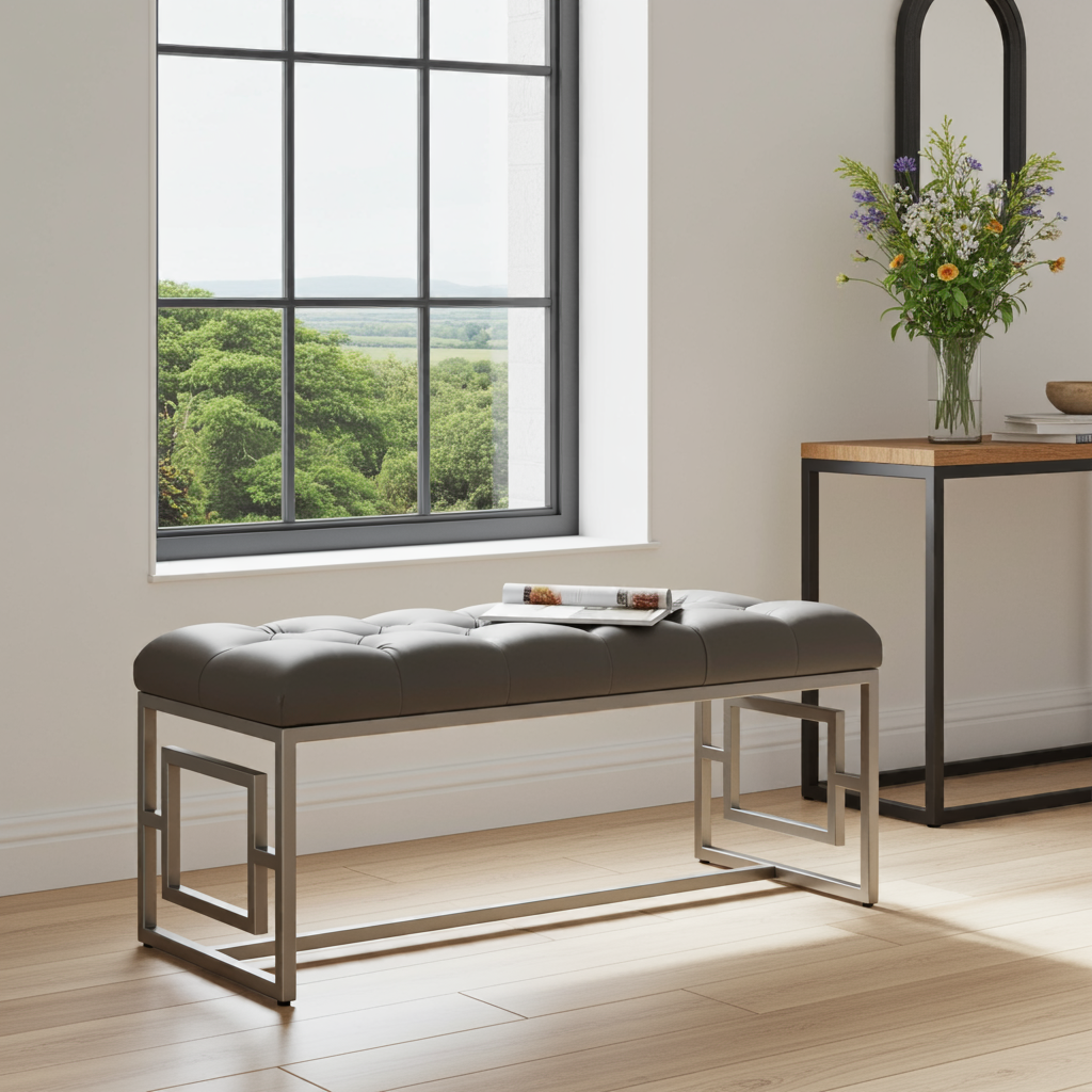 Premium Handcrafted Grey Eco Leather Bench with Contemporary Silver Chrome Frame and Button-Tufted Design for Irish Homes