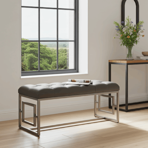 The robust silver chrome frame features a contemporary geometric cube design providing outstanding stability and modern aesthetics. Meanwhile, the premium grey eco leather adds sophisticated comfort and easy maintenance properties. Additionally, the button-tufted design creates elegant visual interest and enhanced seating comfort. Therefore, this bench represents an excellent investment for stylish Irish homes and contemporary living standards.