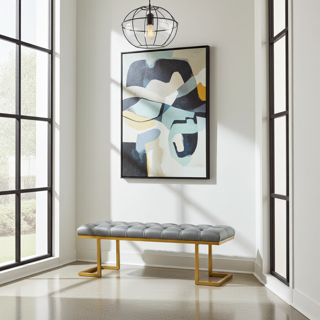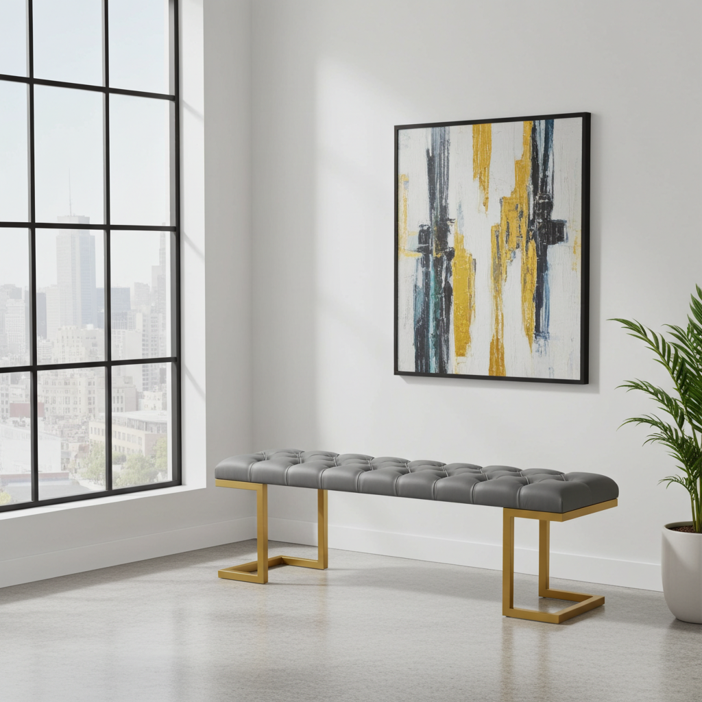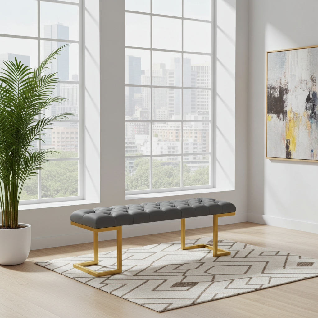 The bench showcases premium grey eco-leather upholstery with deep button tufting. Additionally, this creates luxurious texture and enhanced visual depth. Meanwhile, the gold metal frame features distinctive angular legs for superior stability. Similarly, the powder-coated finish resists daily wear while maintaining its lustrous appearance.