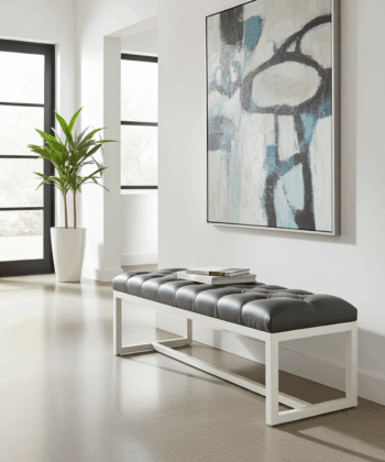 The bench showcases premium grey eco-leather upholstery with deep diamond tufting that creates luxurious texture and visual depth. Additionally, this classic button-tufted surface provides enhanced comfort and timeless elegance. Meanwhile, the white powder-coated steel frame ensures exceptional stability and contemporary appeal. Similarly, the crisp white finish creates a sophisticated aesthetic that perfectly complements modern Irish homes.