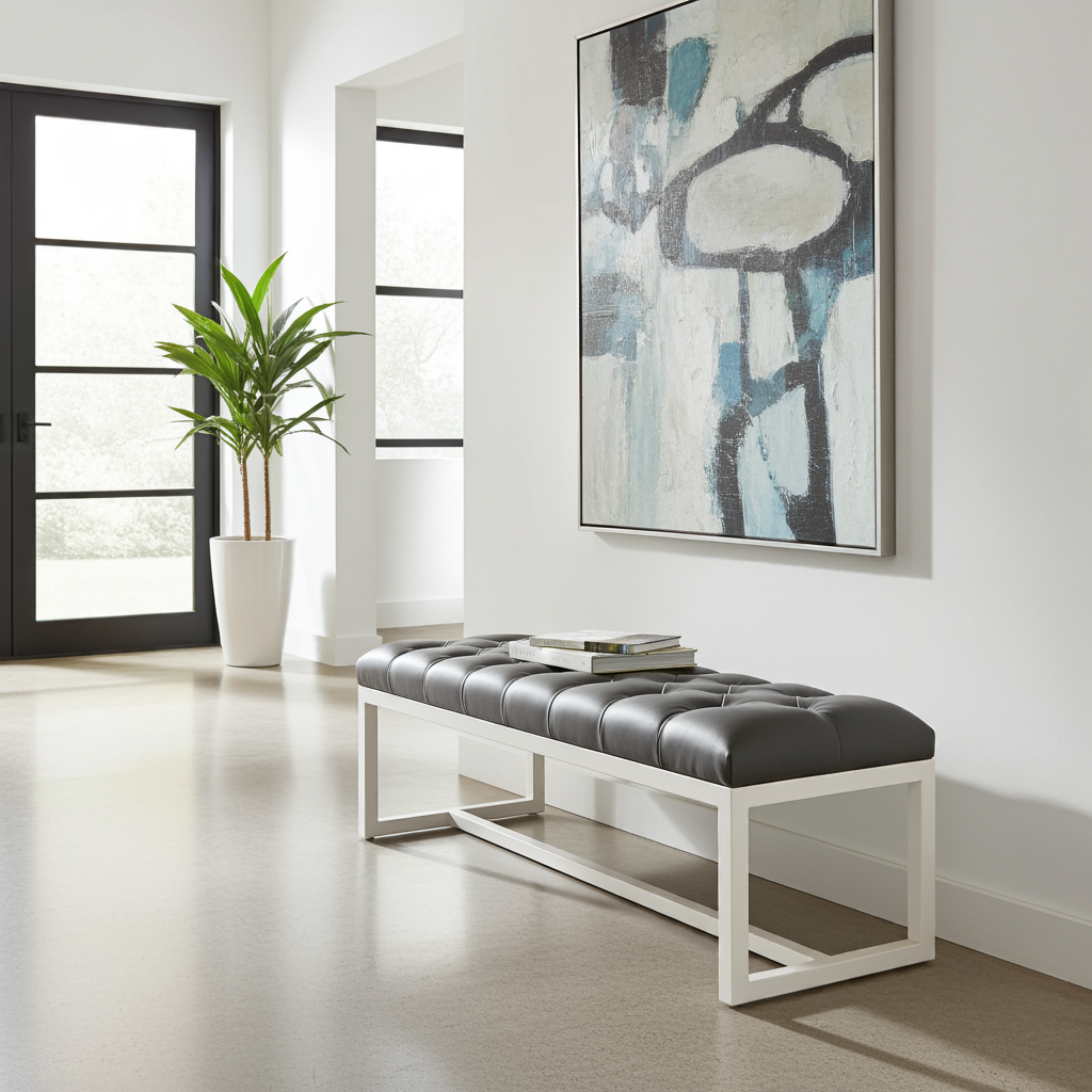 Premium Diamond-Tufted Grey Eco-Leather Bench with Modern White Steel Frame – Sophisticated Seating Solution for Contemporary Irish Homes