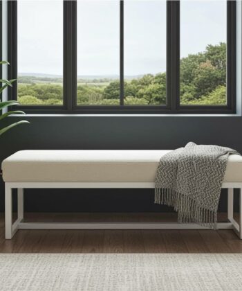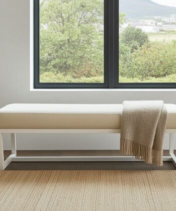 The bench showcases premium beige fabric upholstery that creates comfortable texture and timeless visual appeal. Additionally, this high-quality fabric surface provides enhanced comfort and durability for daily use. Meanwhile, the white powder-coated steel frame ensures exceptional stability and contemporary contrast. Similarly, the clean geometric lines create a sophisticated aesthetic that perfectly complements modern Irish homes.