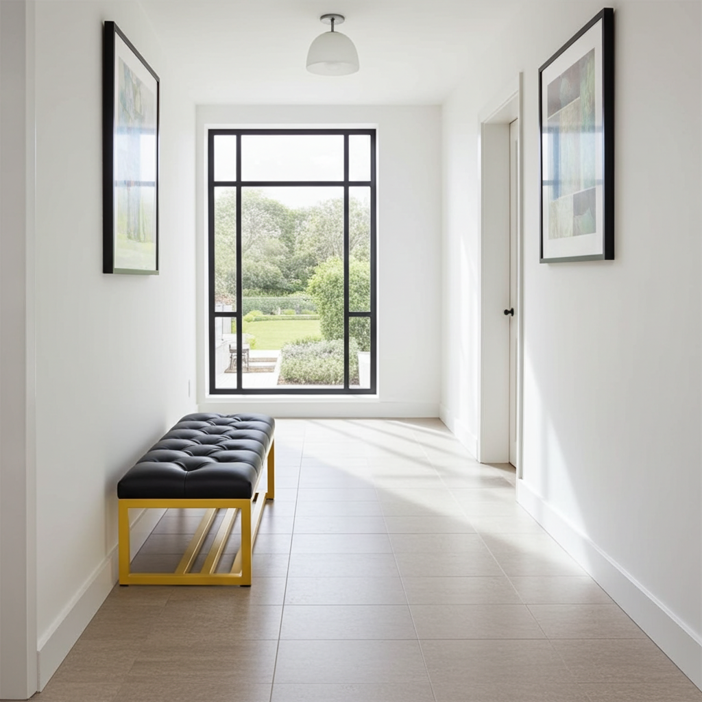 Looking for a bench that combines elegance, comfort, and durability? This metal-framed bench is a fantastic choice for modern Irish interiors. The seat features high-quality, scratch-resistant eco-leather in a deep black shade. Its 10 cm thick cushion provides exceptional comfort for daily use. The frame, made from powder-coated metal, guarantees long-lasting stability and a sleek, minimalist appearance. You can select either a black or white frame, making it easy to coordinate with other furniture.