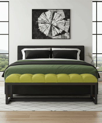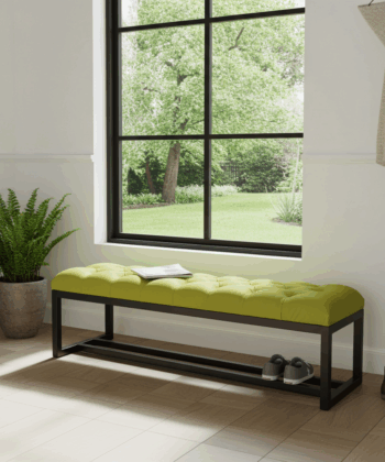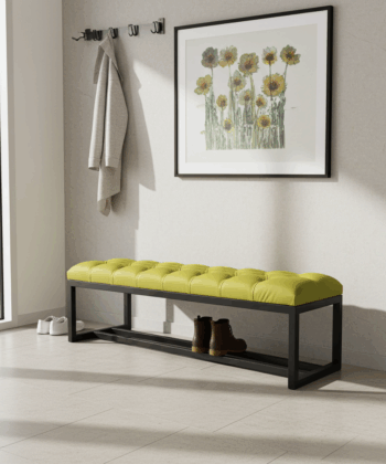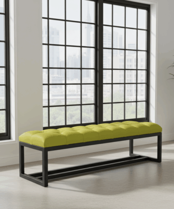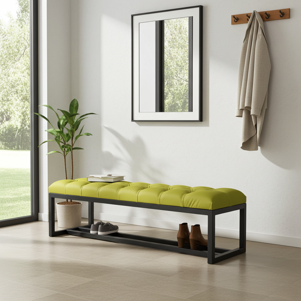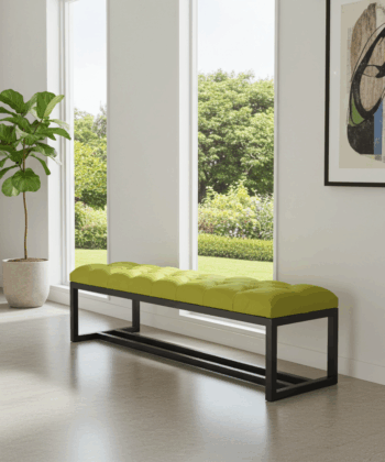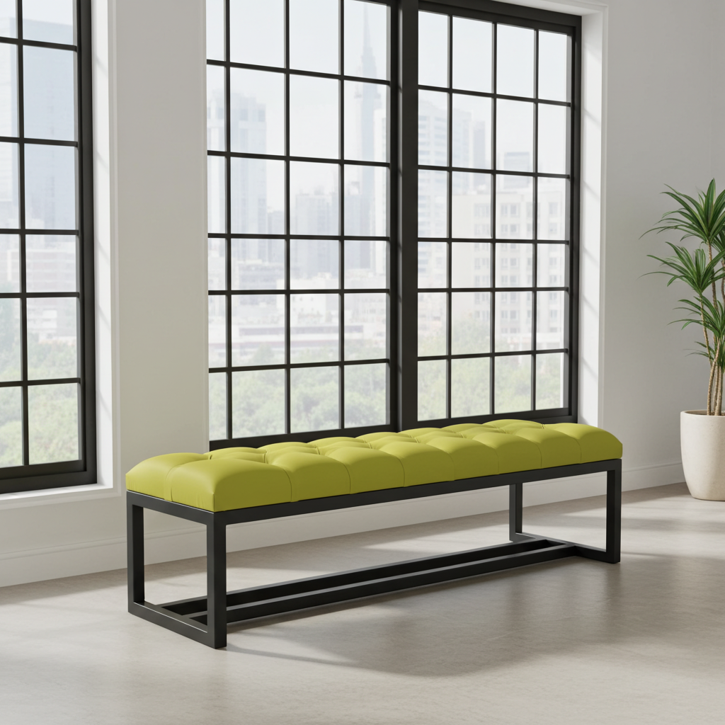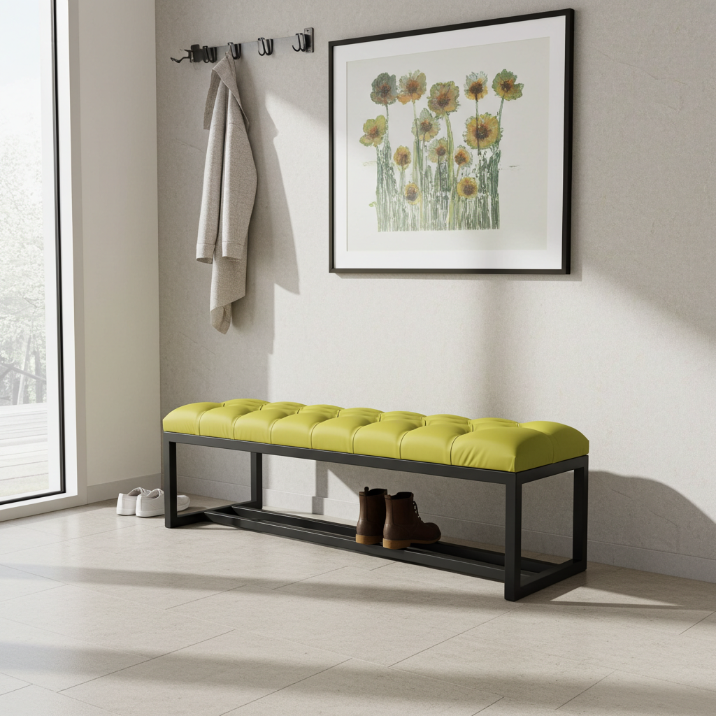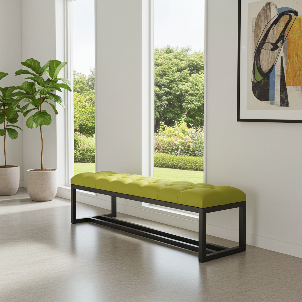 The bench showcases premium green eco-leather upholstery with deep diamond tufting that creates luxurious texture. Additionally, this button-tufted surface provides enhanced comfort and visual depth. Meanwhile, the black powder-coated steel frame features a unique double-frame design for superior stability1. Similarly, the dual horizontal bars create a modern industrial aesthetic that perfectly complements contemporary interiors.