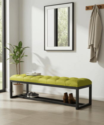The bench showcases premium green eco-leather upholstery with deep diamond tufting that creates luxurious texture. Additionally, this button-tufted surface provides enhanced comfort and visual depth. Meanwhile, the black powder-coated steel frame features a unique double-frame design for superior stability1. Similarly, the dual horizontal bars create a modern industrial aesthetic that perfectly complements contemporary interiors.