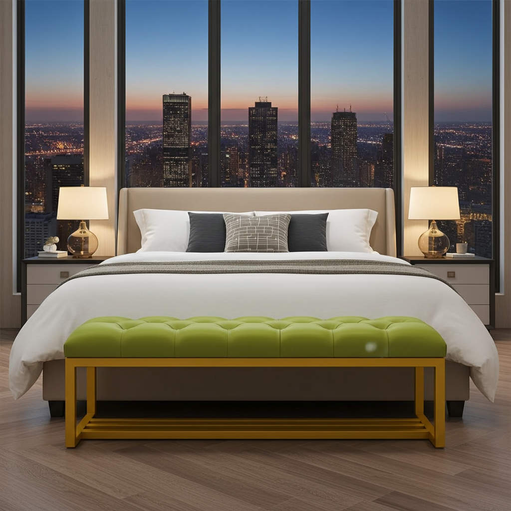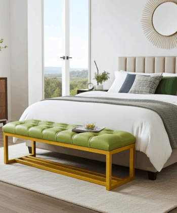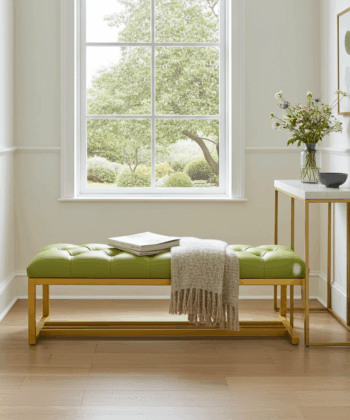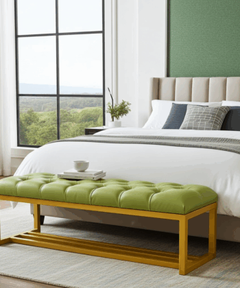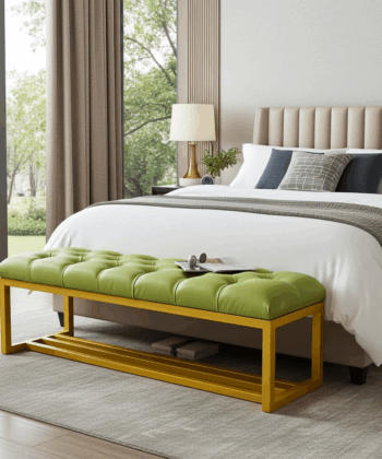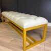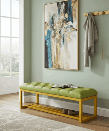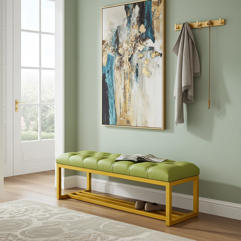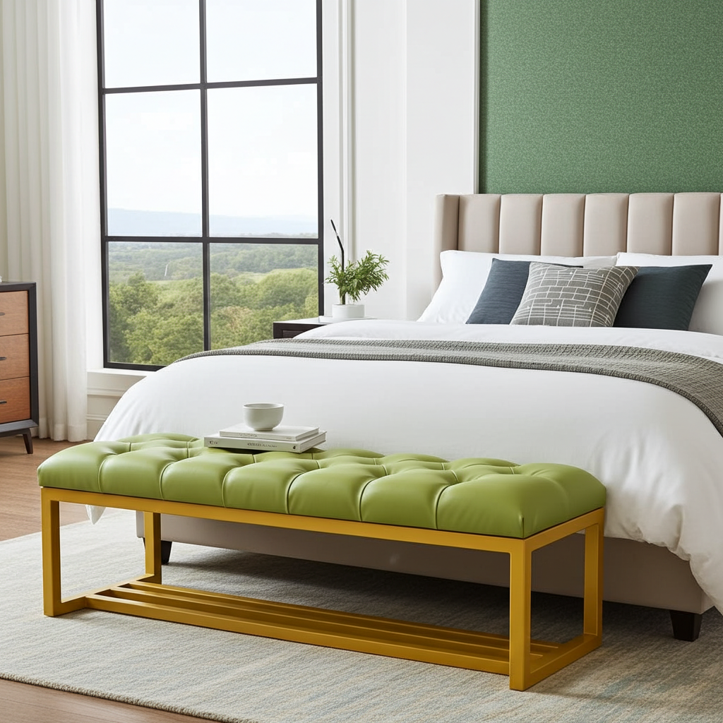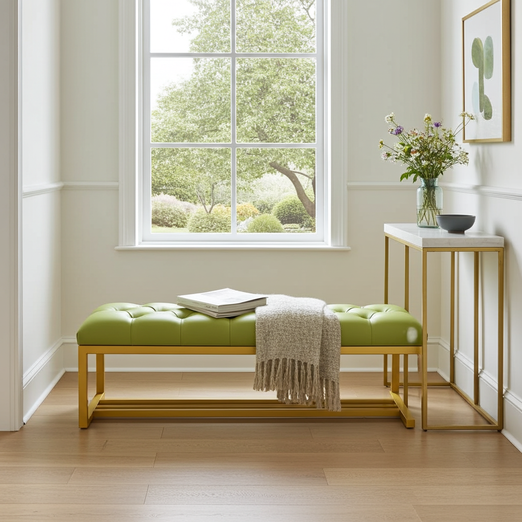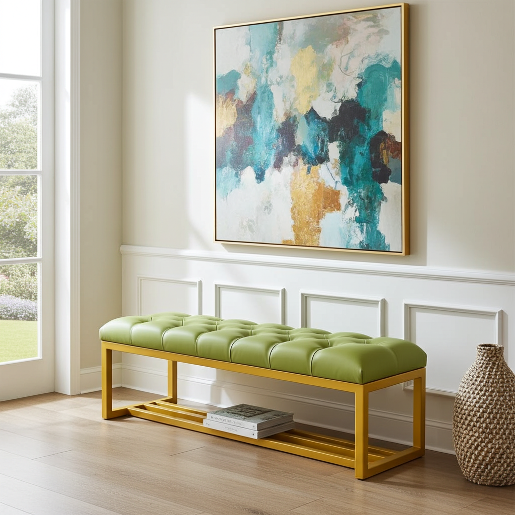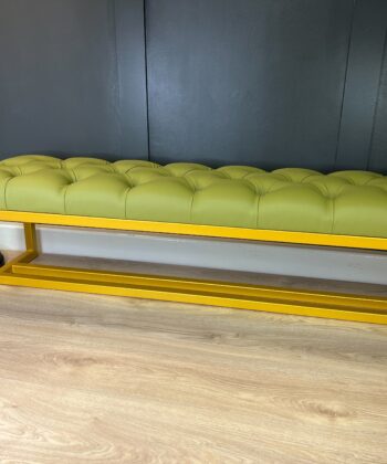 Green eco-leather bench 140x40cm with gold frame. Handcrafted button-tufted seating perfect for stylish Irish homes and modern interiors.