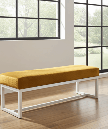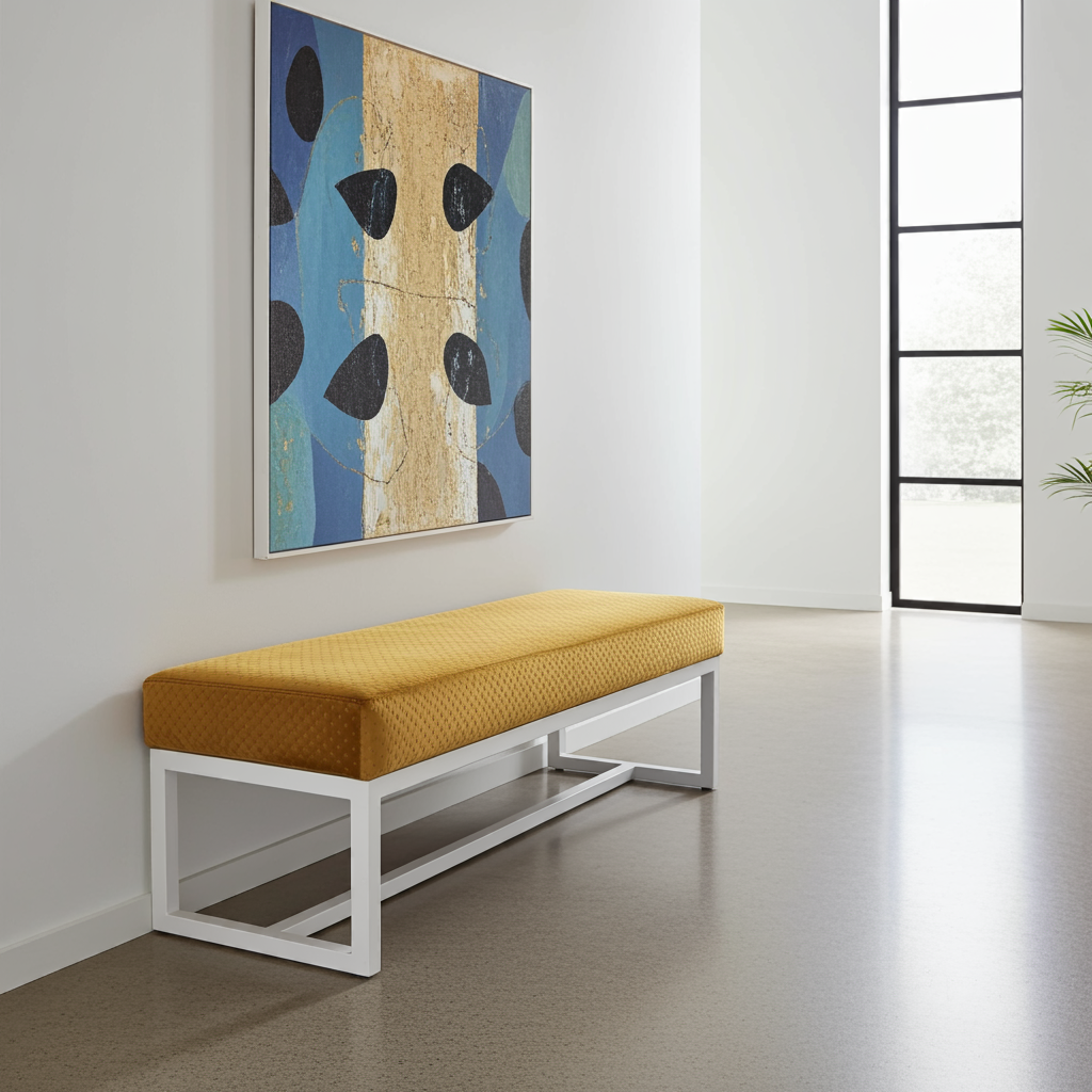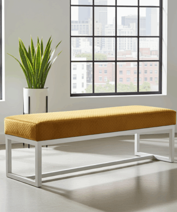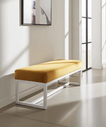 The bench showcases premium mustard yellow velvet upholstery that creates luxurious texture and vibrant visual appeal. Additionally, this high-quality velvet surface provides enhanced comfort and durability for daily use. Meanwhile, the white powder-coated steel frame ensures exceptional stability and contemporary contrast. Similarly, the clean geometric lines create a sophisticated aesthetic that perfectly complements modern Irish homes.