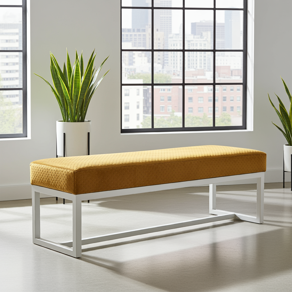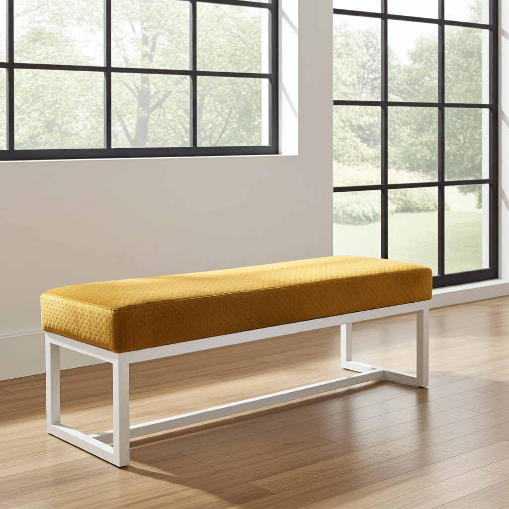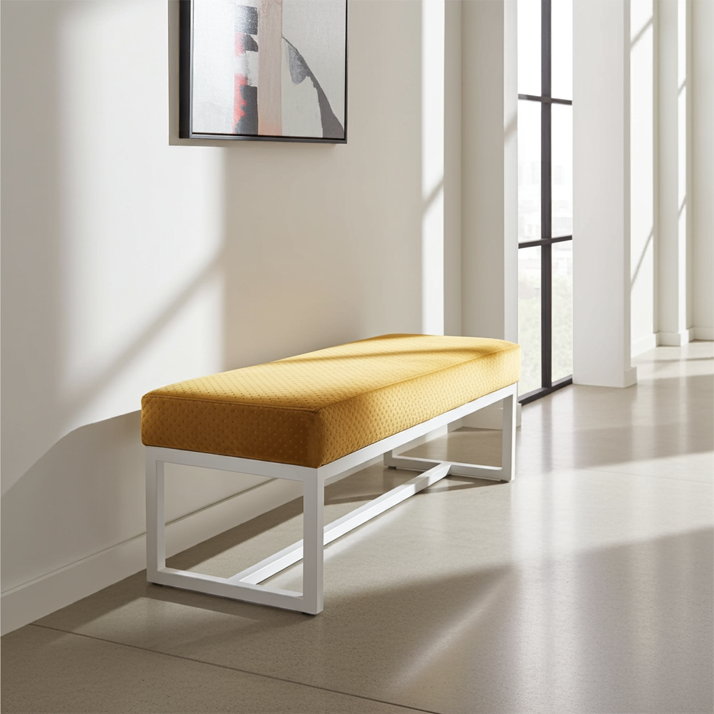 Premium Handcrafted Mustard Yellow Velvet Bench with White Powder-Coated Steel Frame – Luxury Seating Solution for Contemporary Irish Homes