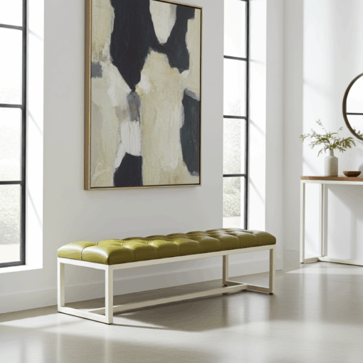 The bench showcases premium olive green eco-leather upholstery with deep diamond tufting that creates luxurious texture and visual depth1. Additionally, this classic button-tufted surface provides enhanced comfort and timeless elegance. Meanwhile, the white powder-coated steel frame ensures exceptional stability and contemporary appeal. Similarly, the crisp white finish creates a sophisticated contrast against the rich olive green upholstery.