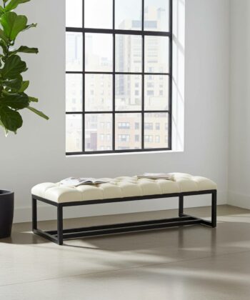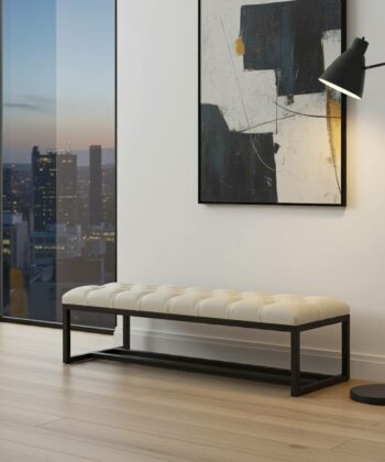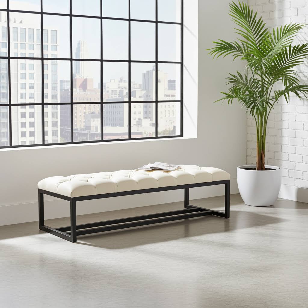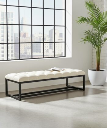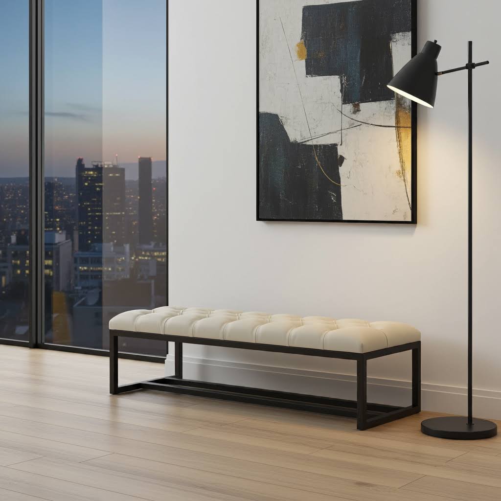 The bench showcases premium white eco-leather upholstery that resists stains and wear. Additionally, the diamond-tufted surface adds luxurious texture and visual appeal. Meanwhile, the black powder-coated steel frame provides exceptional stability. Similarly, the industrial aesthetic perfectly complements contemporary Irish interiors.