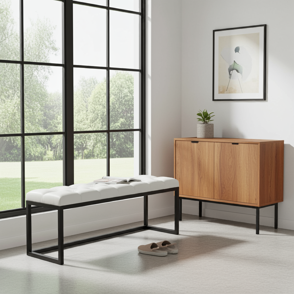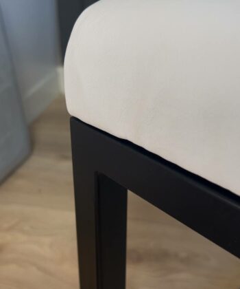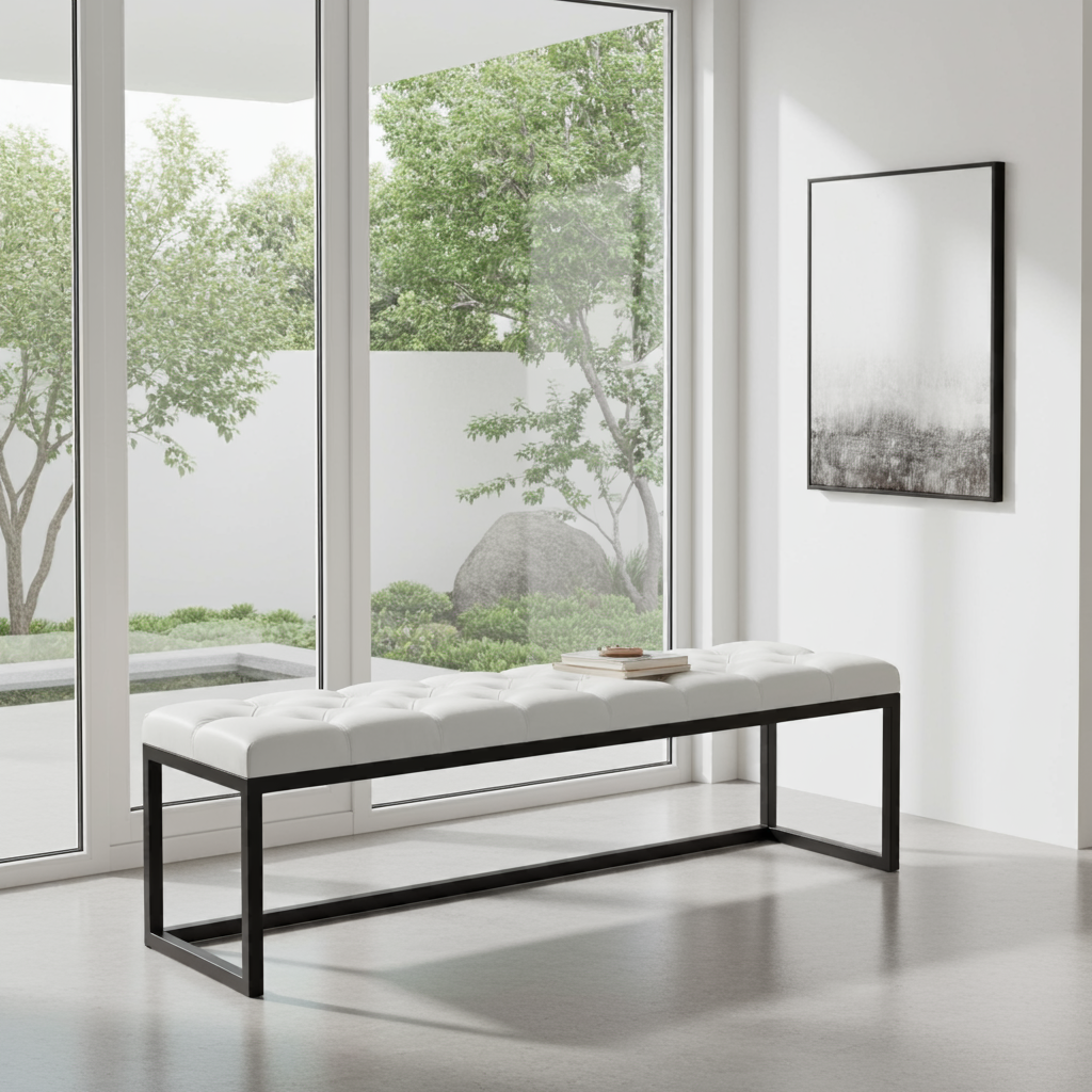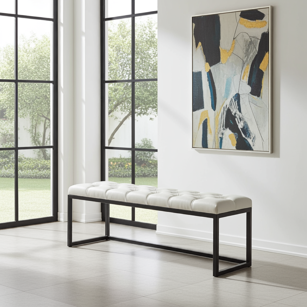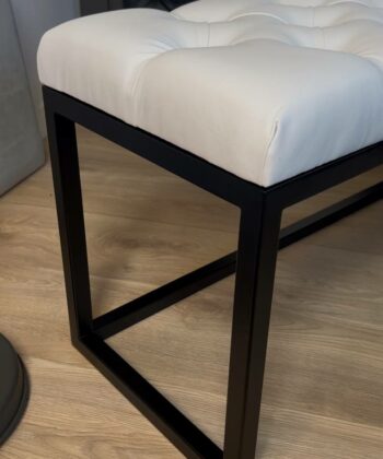The bench displays a seamless black powder-coated metal frame. Additionally, this construction eliminates visible joints or screws. Meanwhile, the tufted white eco-leather seat provides exceptional comfort. Similarly, the industrial aesthetic complements modern interior designs perfectly.