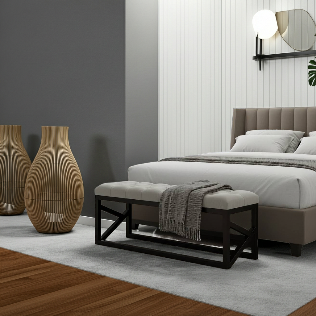 The bench showcases premium beige velvet upholstery with intricate diamond-pattern tufting that creates sophisticated texture and visual depth. Additionally, the warm neutral tones provide versatile styling options that complement various interior color schemes. Meanwhile, the black powder-coated steel frame ensures exceptional structural integrity and contemporary appeal. Similarly, the handcrafted construction delivers superior quality suitable for daily residential use.