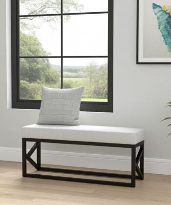 Light Grey Upholstered Bench – Modern Black Metal Frame Seating