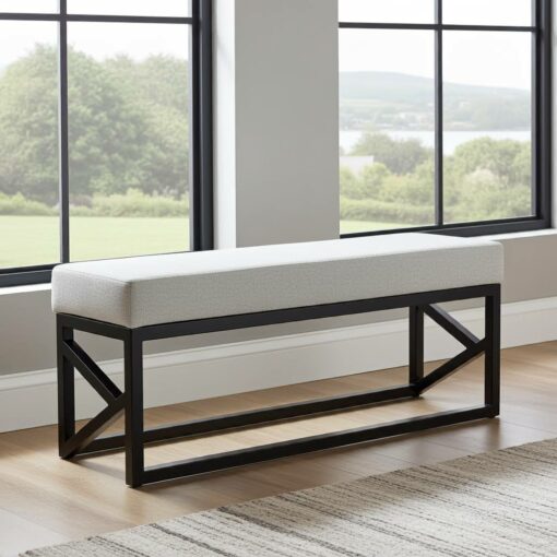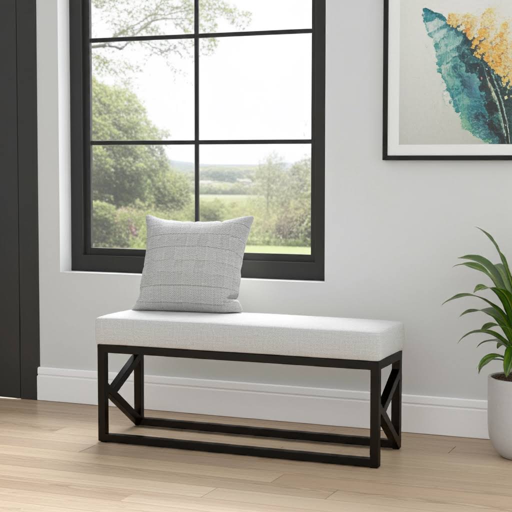 Light Grey Upholstered Bench – Modern Black Metal Frame Seating