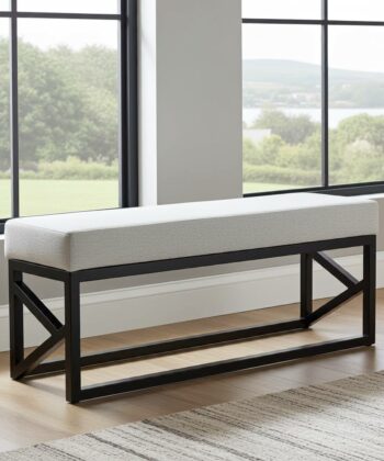 Upgrade your home with the Light Grey Upholstered Metal Bench with Black Geometric Frame – EleganceEase 100x30cm. This handmade bench features a soft, light grey fabric seat that provides both comfort and a modern, neutral accent for any interior. The sturdy, powder-coated black metal frame showcases a geometric design, adding a bold and contemporary touch to your space. Because the bench is fully handmade, you benefit from exceptional craftsmanship and attention to detail12.