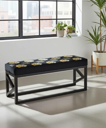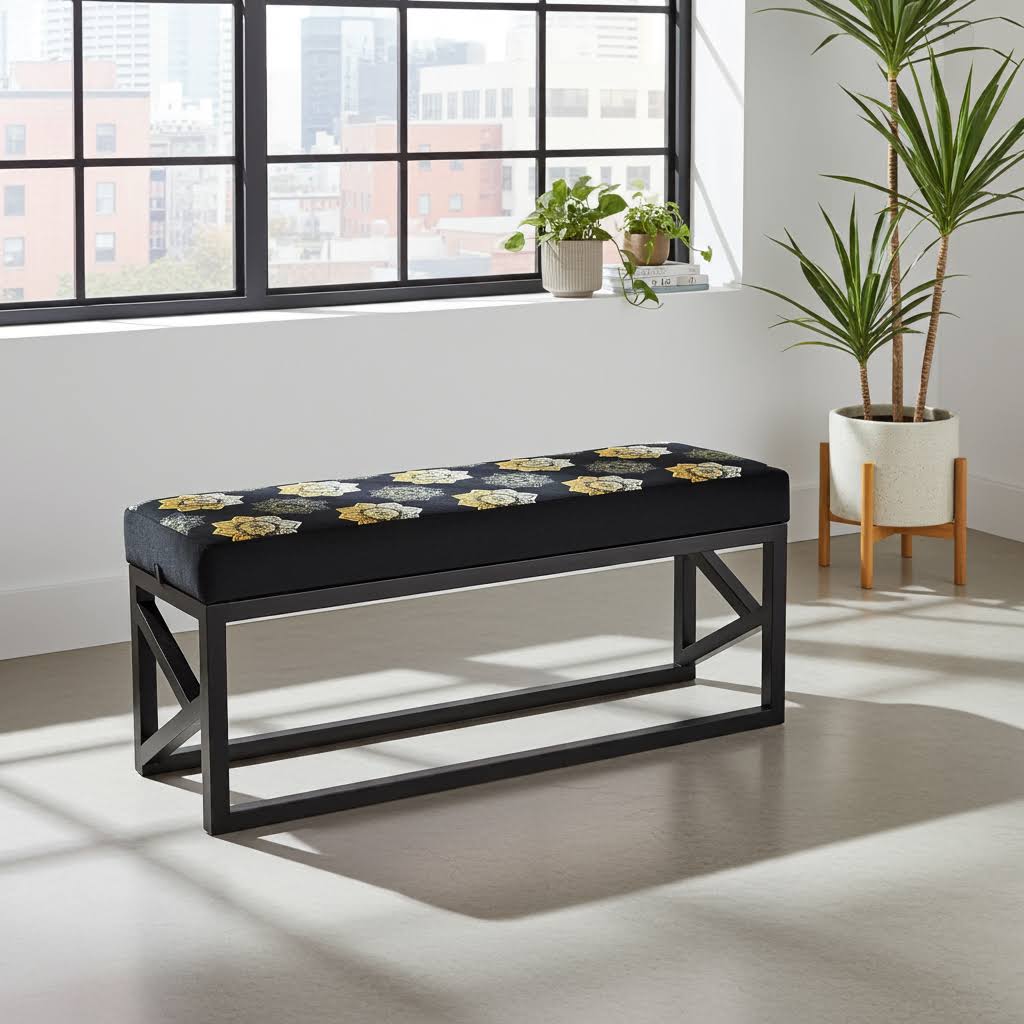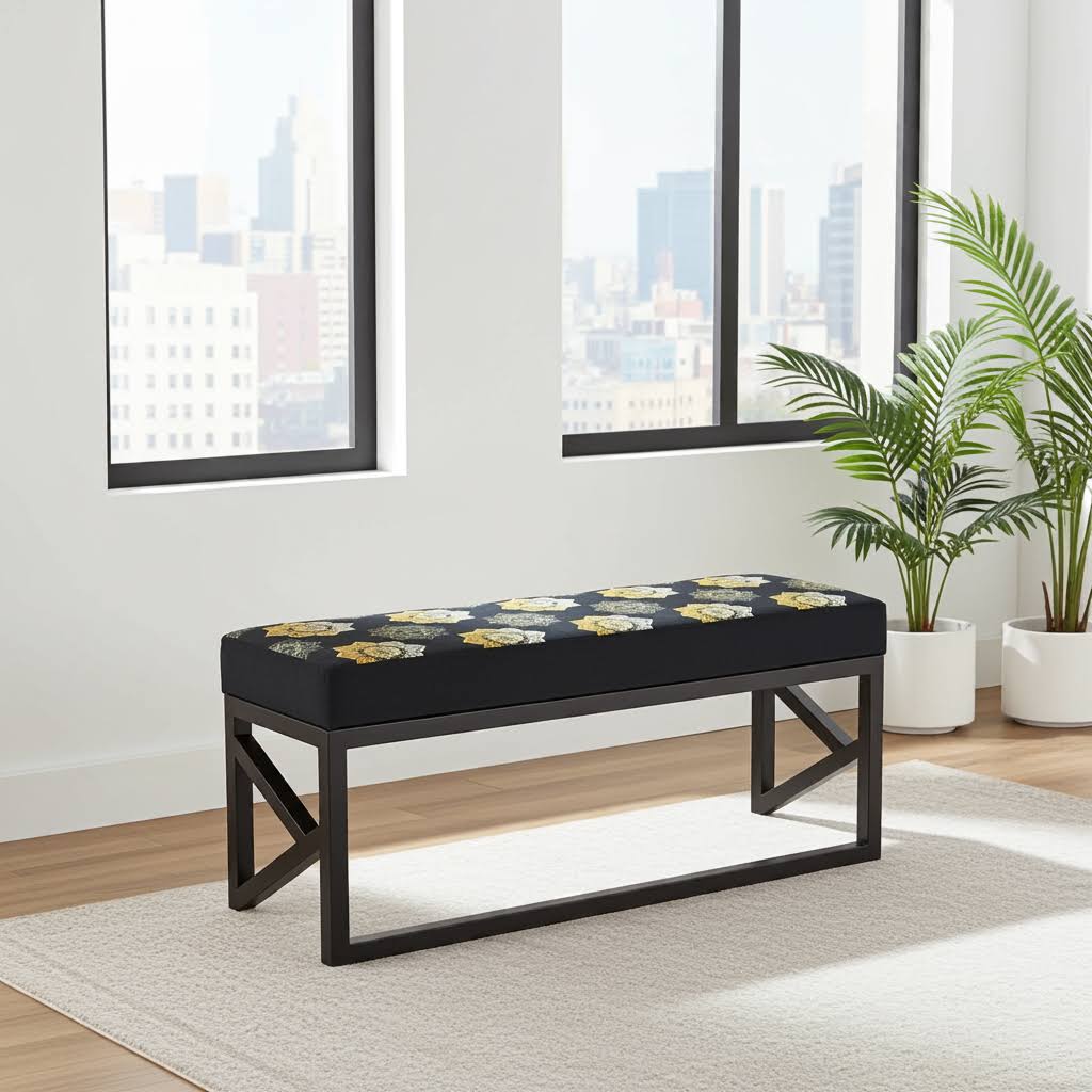 Introduce a unique statement piece to your home with the Mosaic Blossom Velvet Bench from PouffeLove. Inspired by the intricate mosaic floral pattern on the seat, this bench stands out with its rich yellow and green motifs set against a deep black background. The plush velvet upholstery feels soft and inviting, while the powder-coated black metal frame delivers modern stability and a geometric edge12.