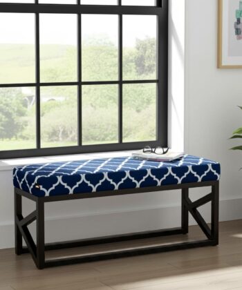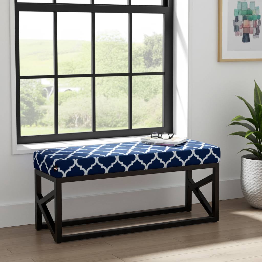 Elevate your home with the Navy Trellis Metal-Framed Bench from the EleganceEase Collection by PouffeLove. This bench features a bold navy velvet seat with a crisp white trellis pattern, creating a modern statement in any room. The sleek, powder-coated black metal frame delivers both stability and a geometric edge, making this piece perfect for contemporary and minimalist interiors.